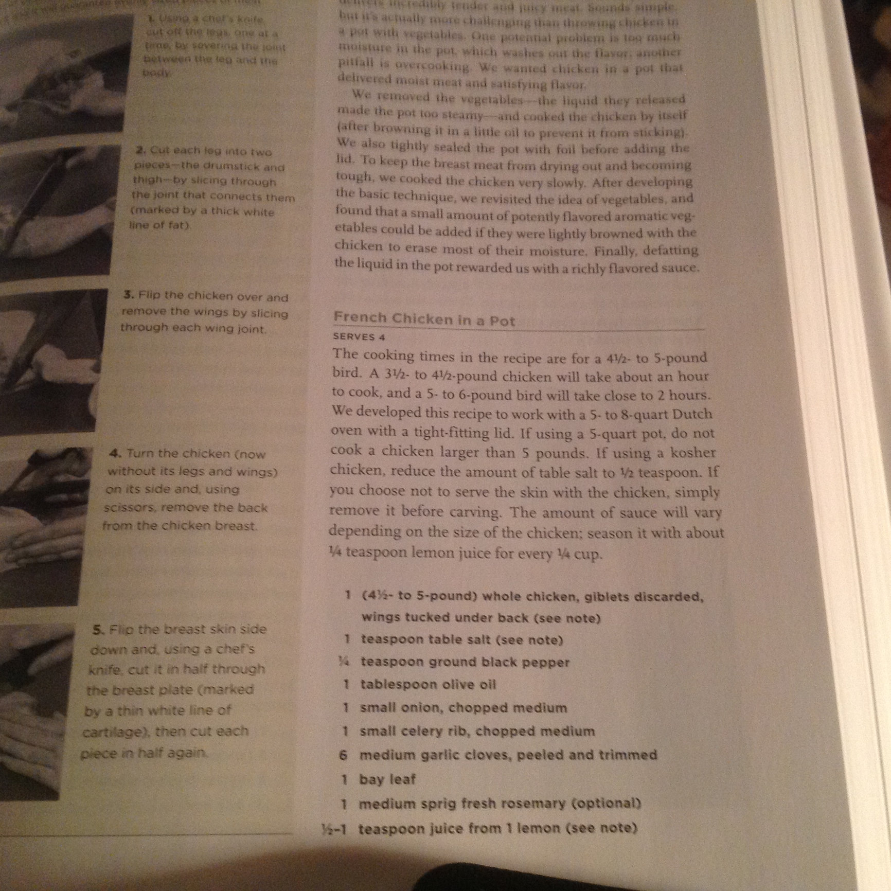 It's a recipe called French Chicken in a pot from America's Test Kitchen back in Jan 2008. I'm in the process of fixing it for our supper tonight. In brief it's a classic French technique where the chicken turns out super juicy, flavorful and tender. It also renders a delicious jus which I serve over mashed potatoes.