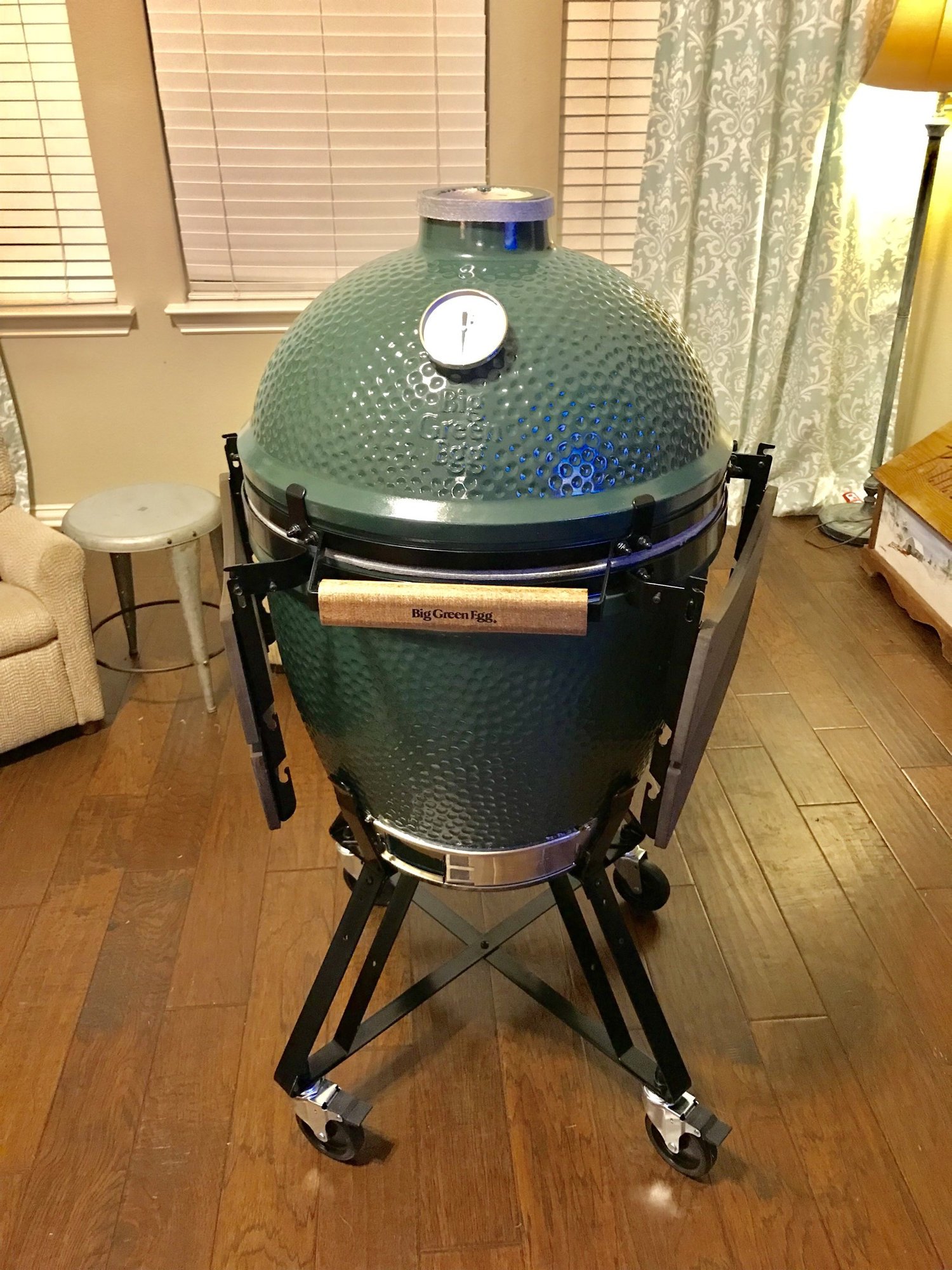 Welcome. All great advice above. Check the tightness of your top and bottom band bolts in the back...and never push your Egg, always pull it when moving it.
