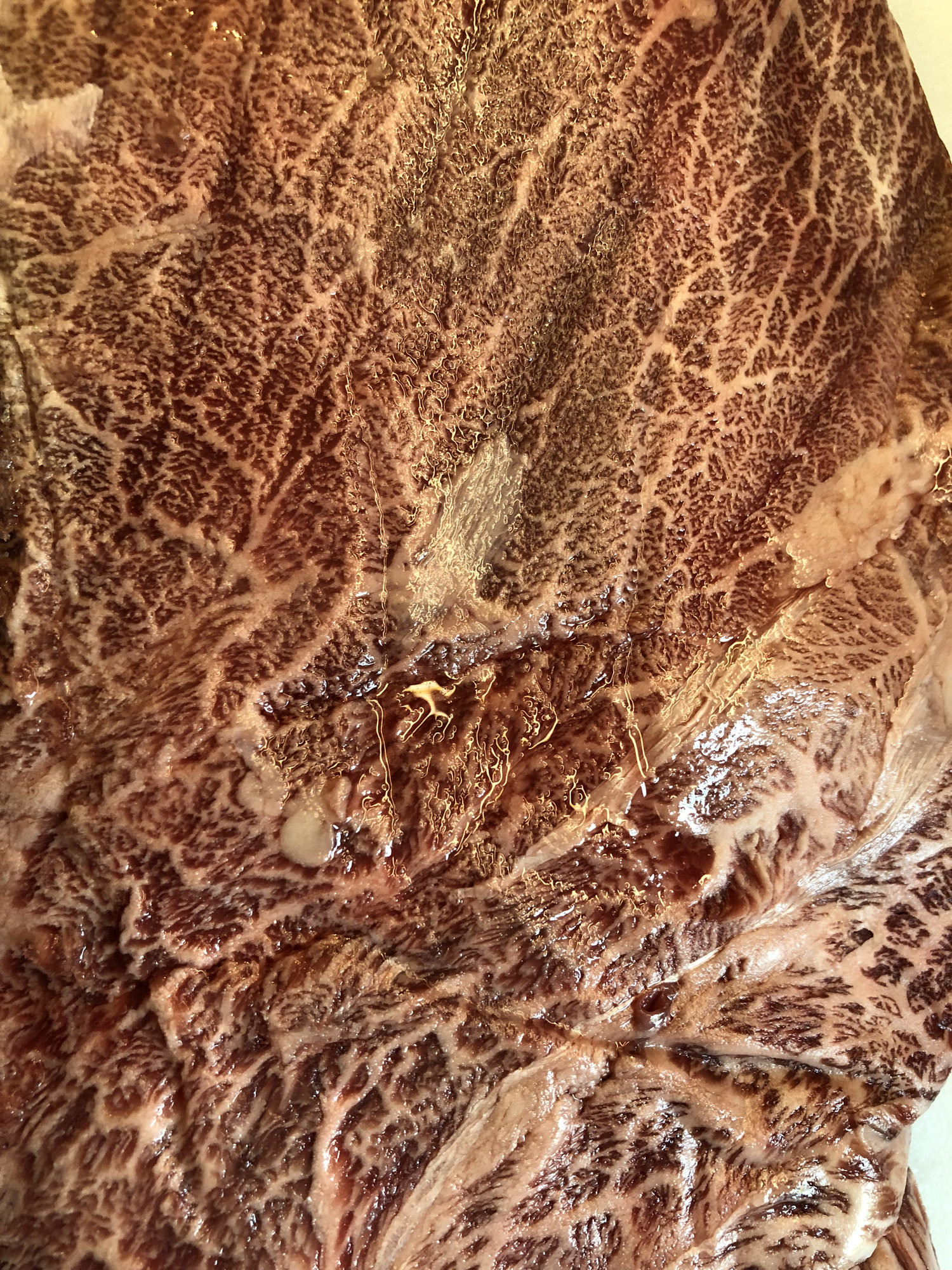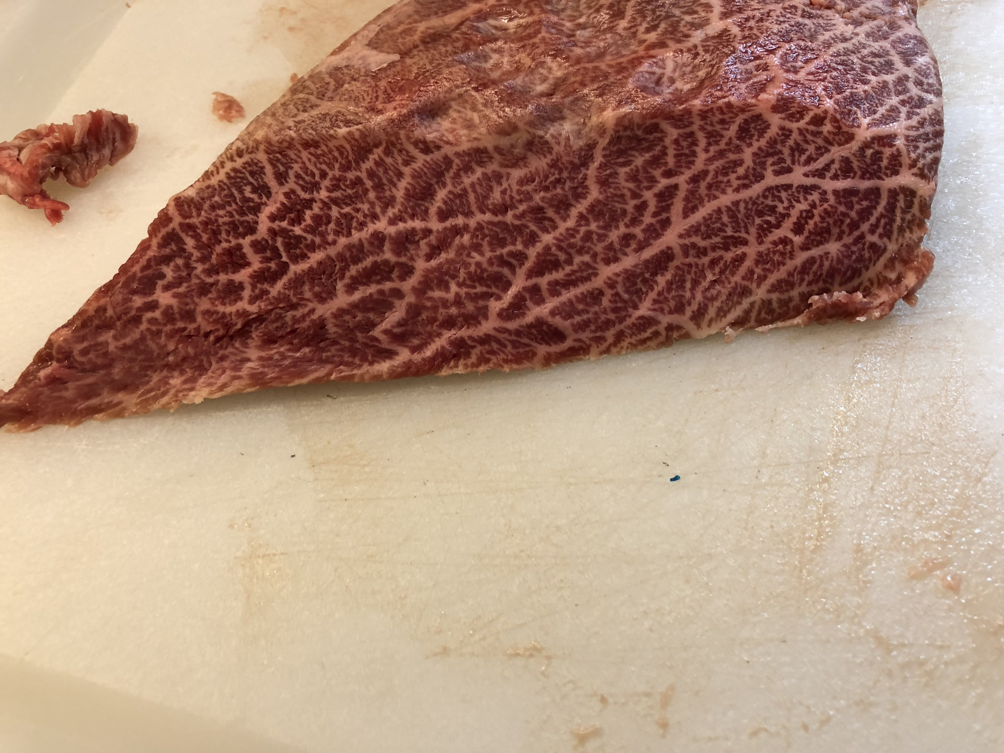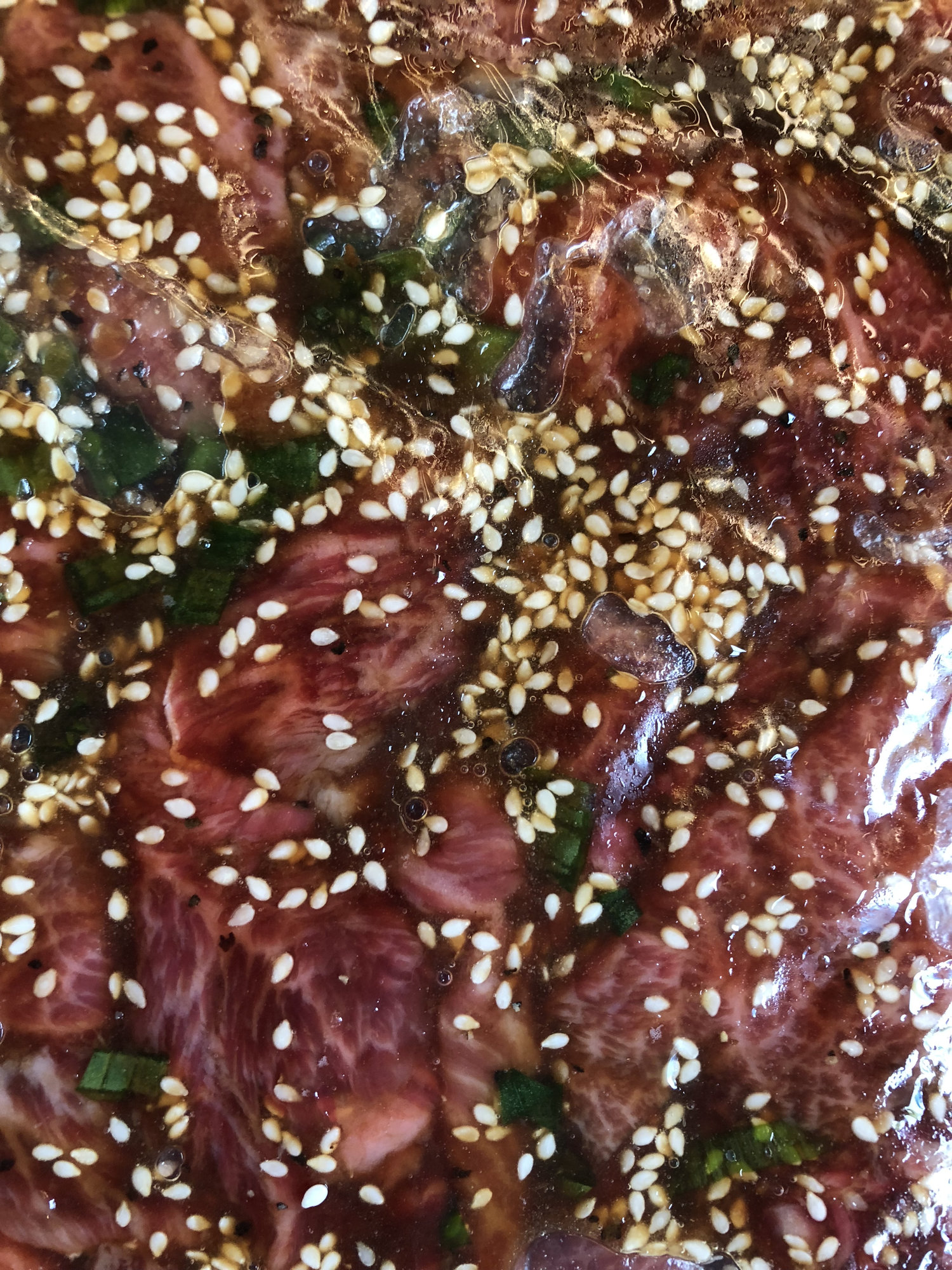 Broke in to the new stash of wagyu. Gave one flat iron to legume after he bought us dinner and drinks last night (we came out way ahead on that deal) but I had one left. Sliced it on the bias and put in the marinade for bulgogi later tonight. I don’t know what he feeds these cows but it sure makes them pretty.