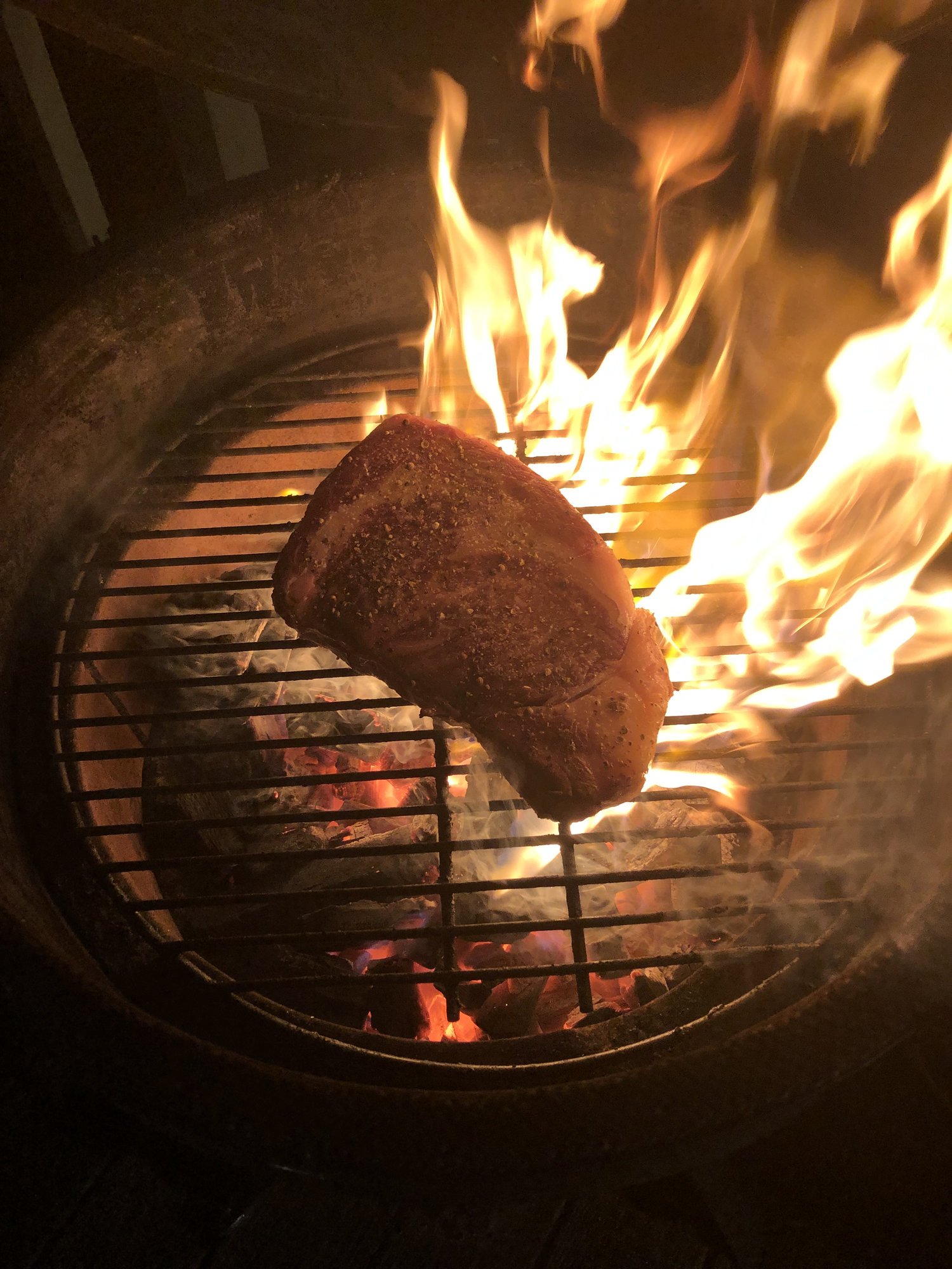Hard sear 2 min per side over ripping hot open dome bge then shut down for indirect finish with oak chunk at 275-300. Pulled at 132.