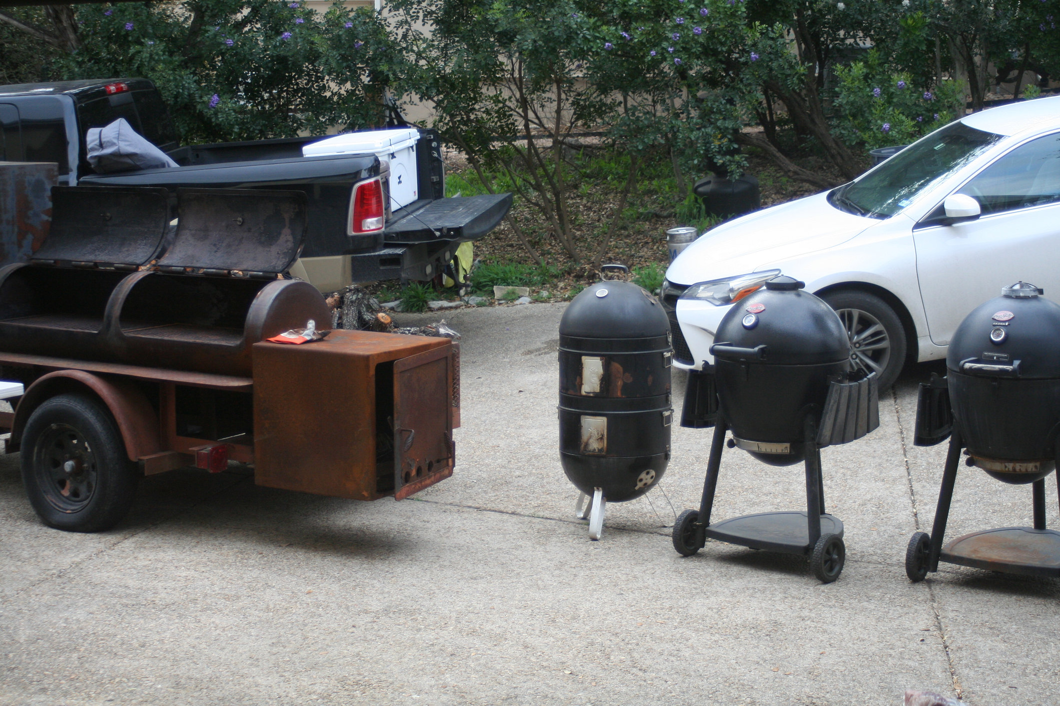 XXL BGE, Karebecue, Klose BYC, Chargiller Akorn Kamado, Weber Smokey Mountain, Grand Turbo gasser, Weber Smoky Joe, and the wheelbarrow that my grandfather used to cook steaks from his cattle