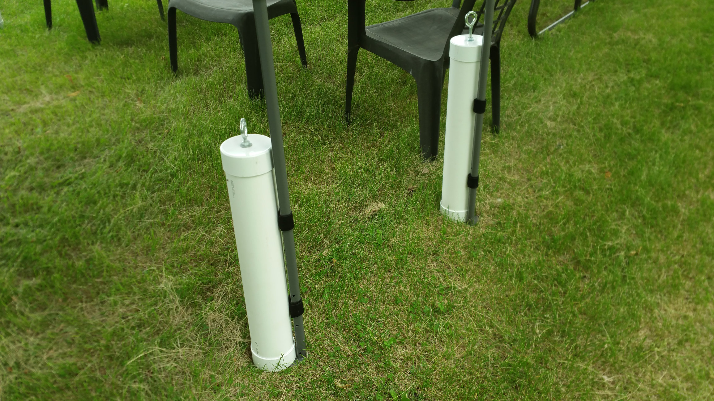 We got some small buckets and filled them with mixed concrete. We stuck a bolt in the center. Put them under the legs, bolt sticking up thru the hole in bottom of the legs and add / thigh ten a nut. Raises the tent a bit and want budge in high winds.Ellijay GA with a Medium & MiniMax