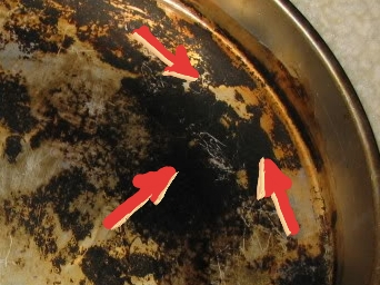 I have never been able to get that pan any cleaner than this with scouring, harsh chemicals or a few hours of elbow grease! Perhaps a random orbital sander might do the trick, but now all these years later that pan has been "out of sight - out of mind" for my wife.