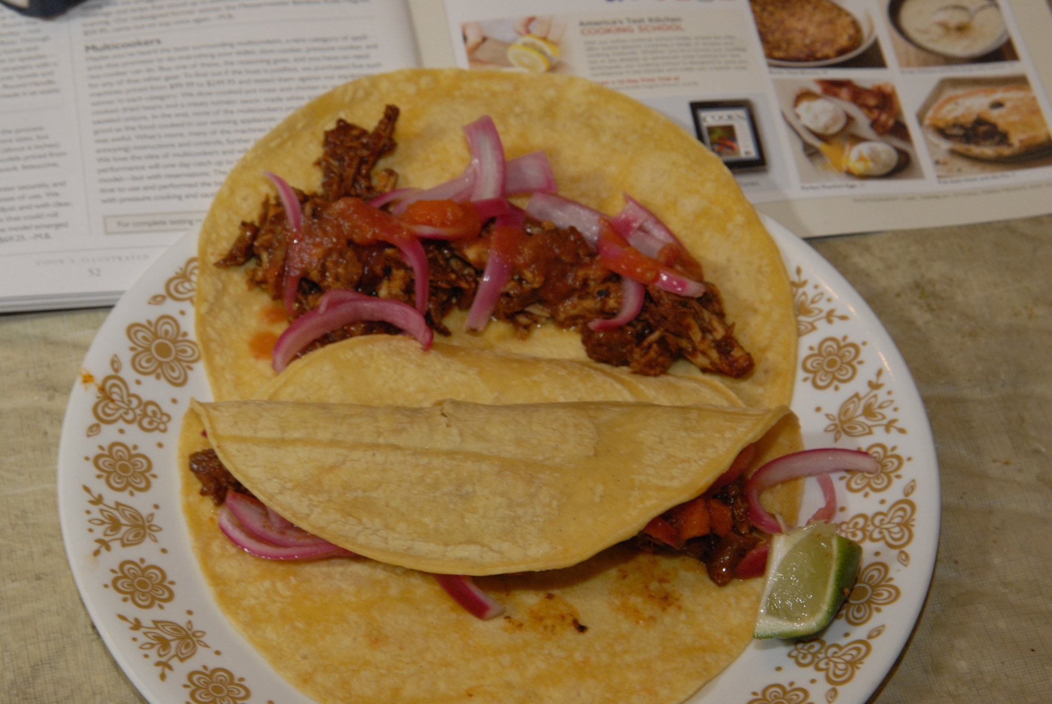 Toast corn tortillas over Egg, spoon in pibil, top with onion and sauce, squirt w/fresh lime, enjoy.One other change I'll make in the future: that 1/4 cup of orange juice concentrate was a mess to thaw out and measure; next time I'll replace the water and concentrate with a single serving of OJ plus enough water to make 1 3/4 cups.