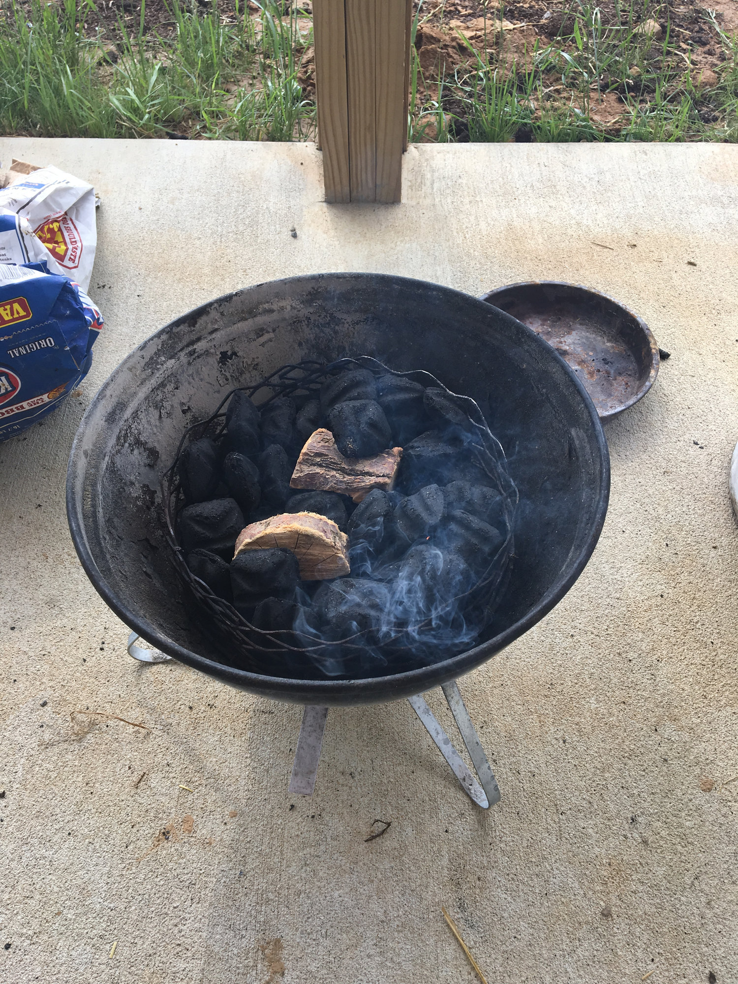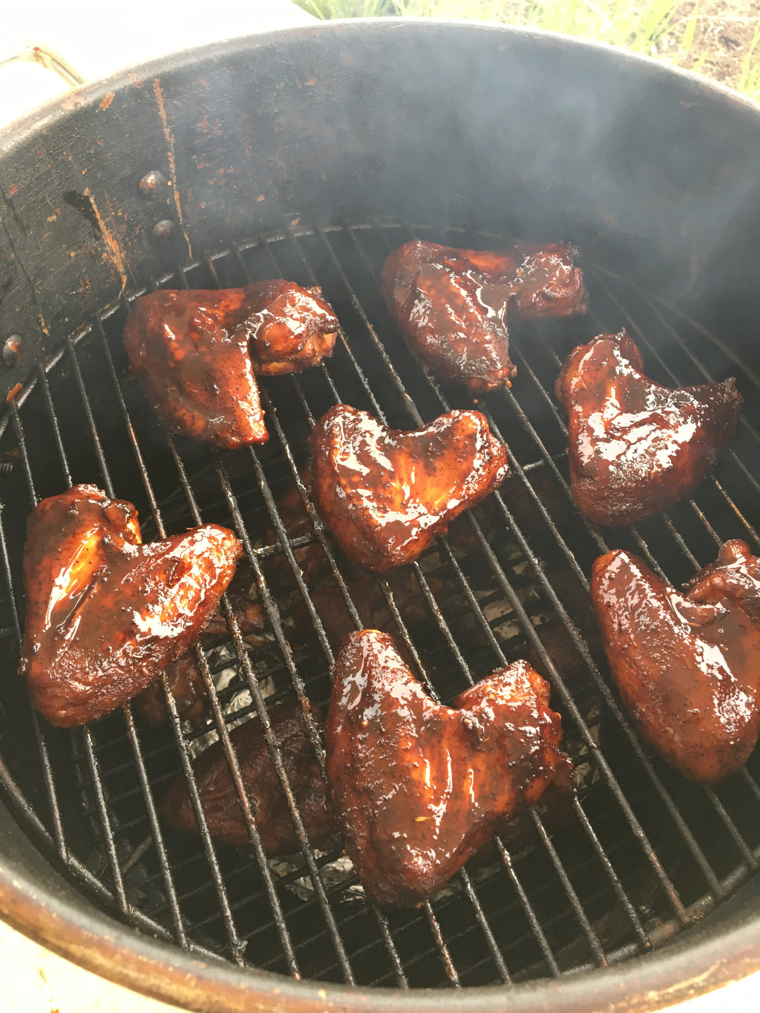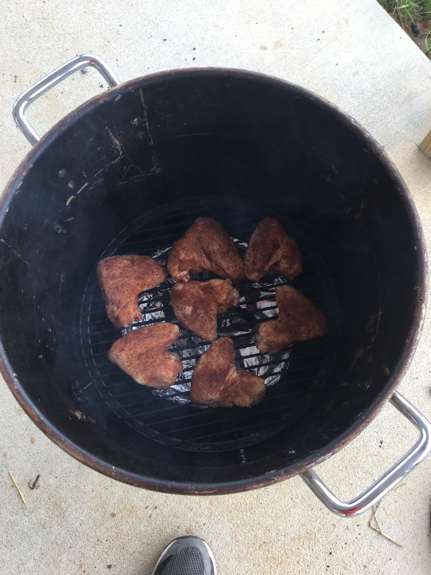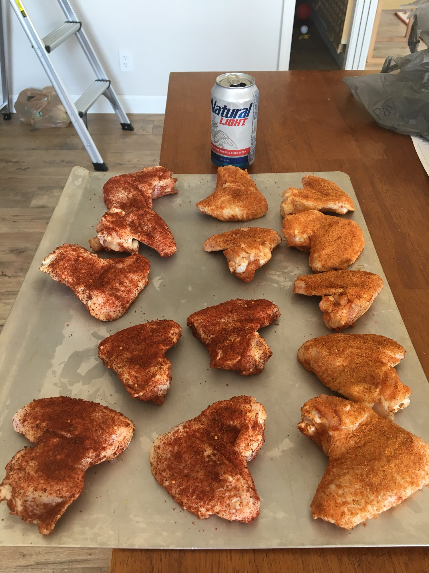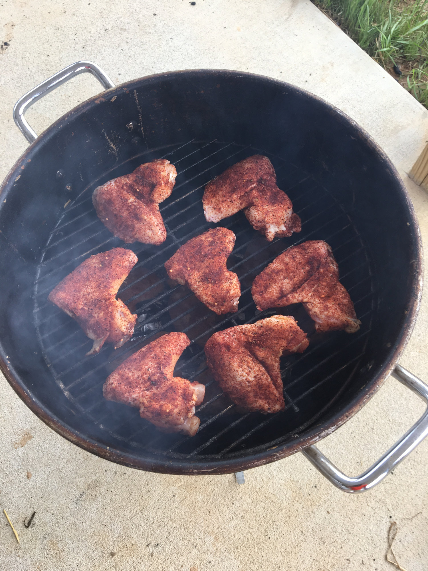Good afternoon all! I decided to drag out my homemade mini weber smokey mountain made from a smokey joe silver. Doing wings two ways on it today. The reddish tint wings are blues hog rub, the more tan/brown wings are a combo of habanero death dust and some quaker steak n lube chipotle bbq seasoning.