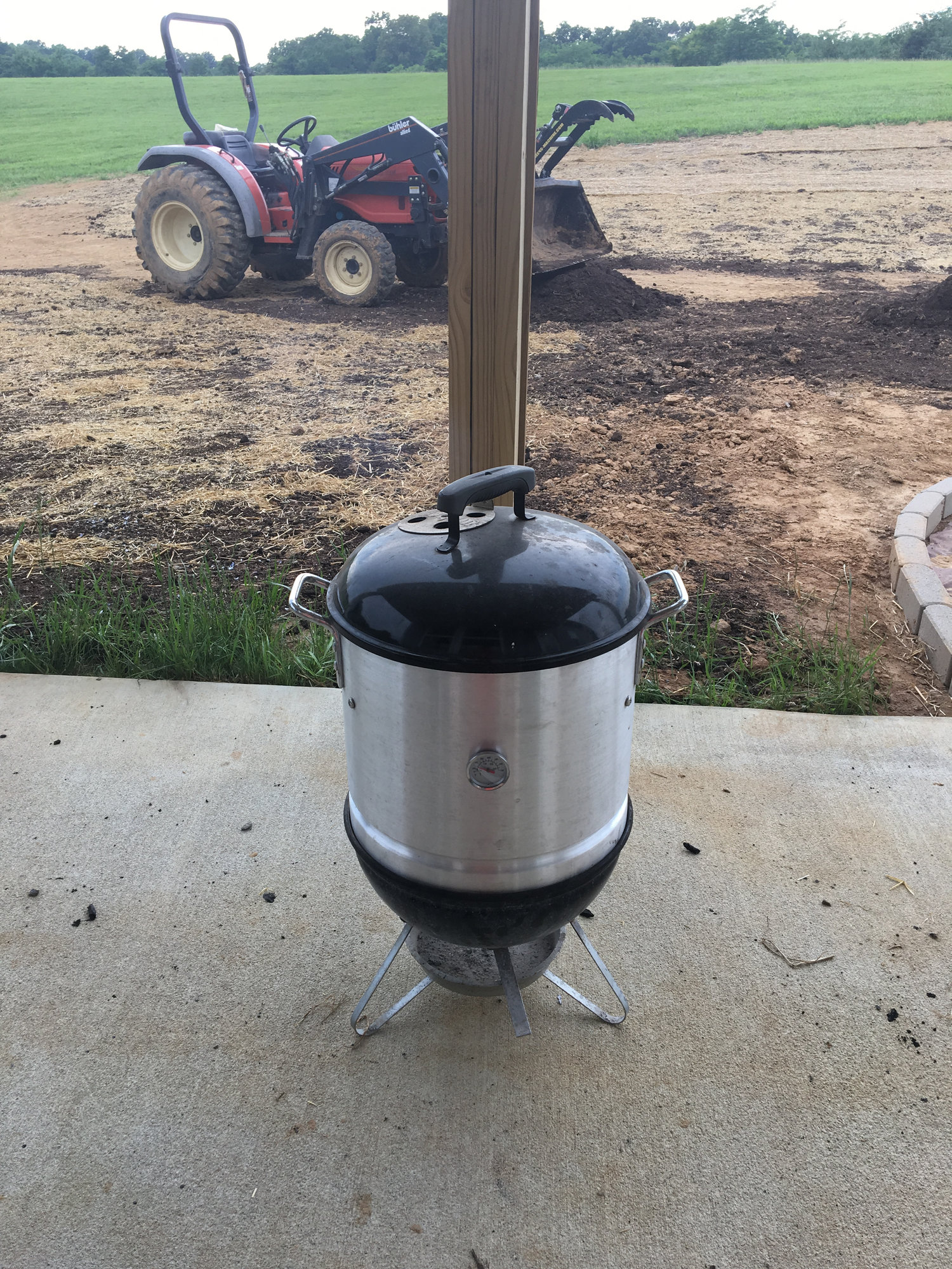 If noone knows what a mini wsm is, i took a smokey joe silver and added a tamale pot and a few racks. The thermometer on the side reads like 85-100 degrees low. But it puts out some good bbq