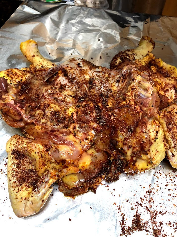 After spatchcocking the chicken (removing the backbone and flattening), put the chicken in a pyrex dish (pie plate, 13x9, etc...) back in the refrigerator for another 2-3 days to let the skin dry out. Then rub with EVOO and your favorite steak rub. Bake 375*F 30 minutes each side, direct heat, and thank me later. MMM good. It's my lovely bride's favorite chicken (married 30 years this year).