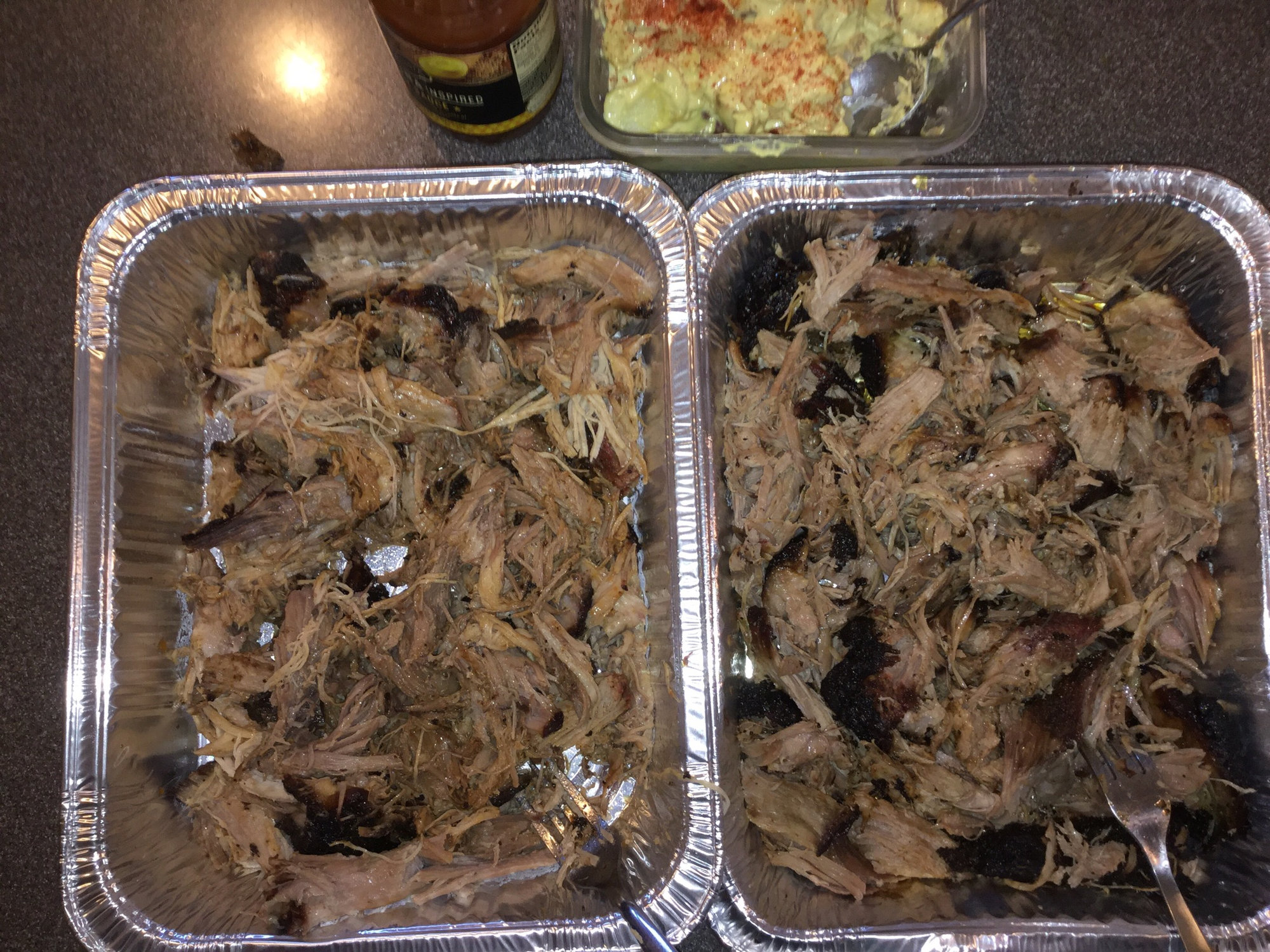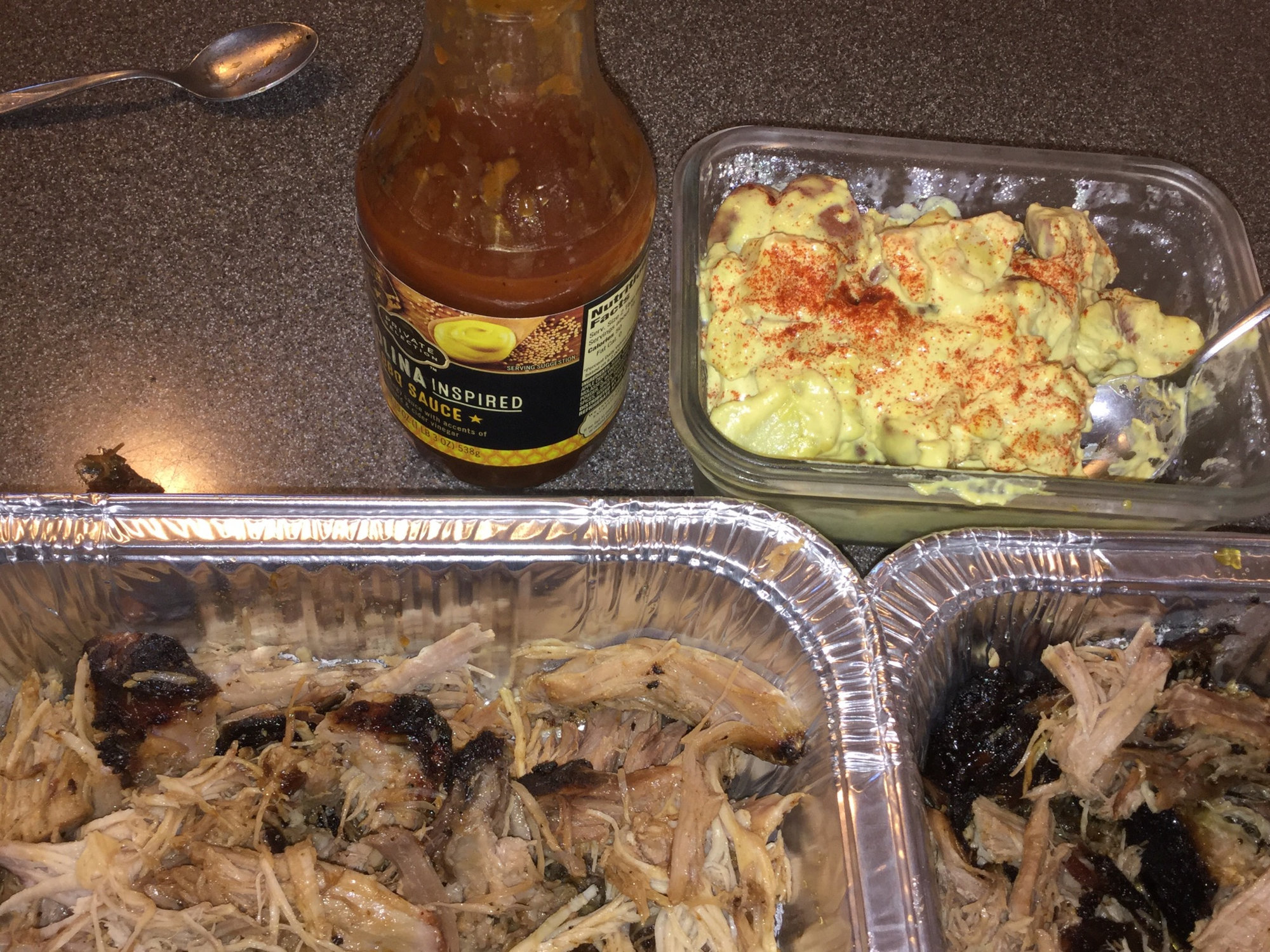An egging friend came over and helped me “test” the pork after I added some Kroger’s “Carolina Inspired BBQ sauce”. Good bark and the potato salad was really good. Maurice’s Gold and Hellmans Mayo. Very tasty. Hope you all have a great time with family the rest of the evening.