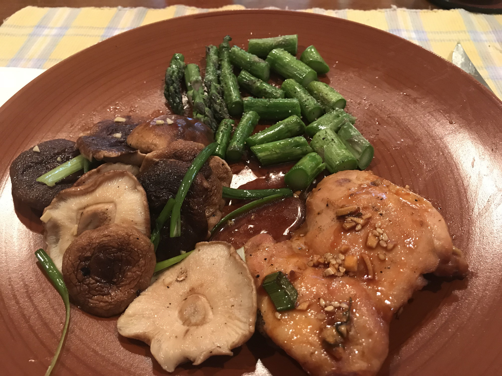Sorry I didn’t get any pics of the cook in progress.  SWMBO was using my phone to look at a recipe.  Korean Chicken, grilled shiitakes with garlic & ginger with grilled asparagus.  Ended with mango stuffed sticky rice balls topped coconut cream sauce.  Happy Fathers Day everyone.  Thanks for the great posts and continued inspiration!