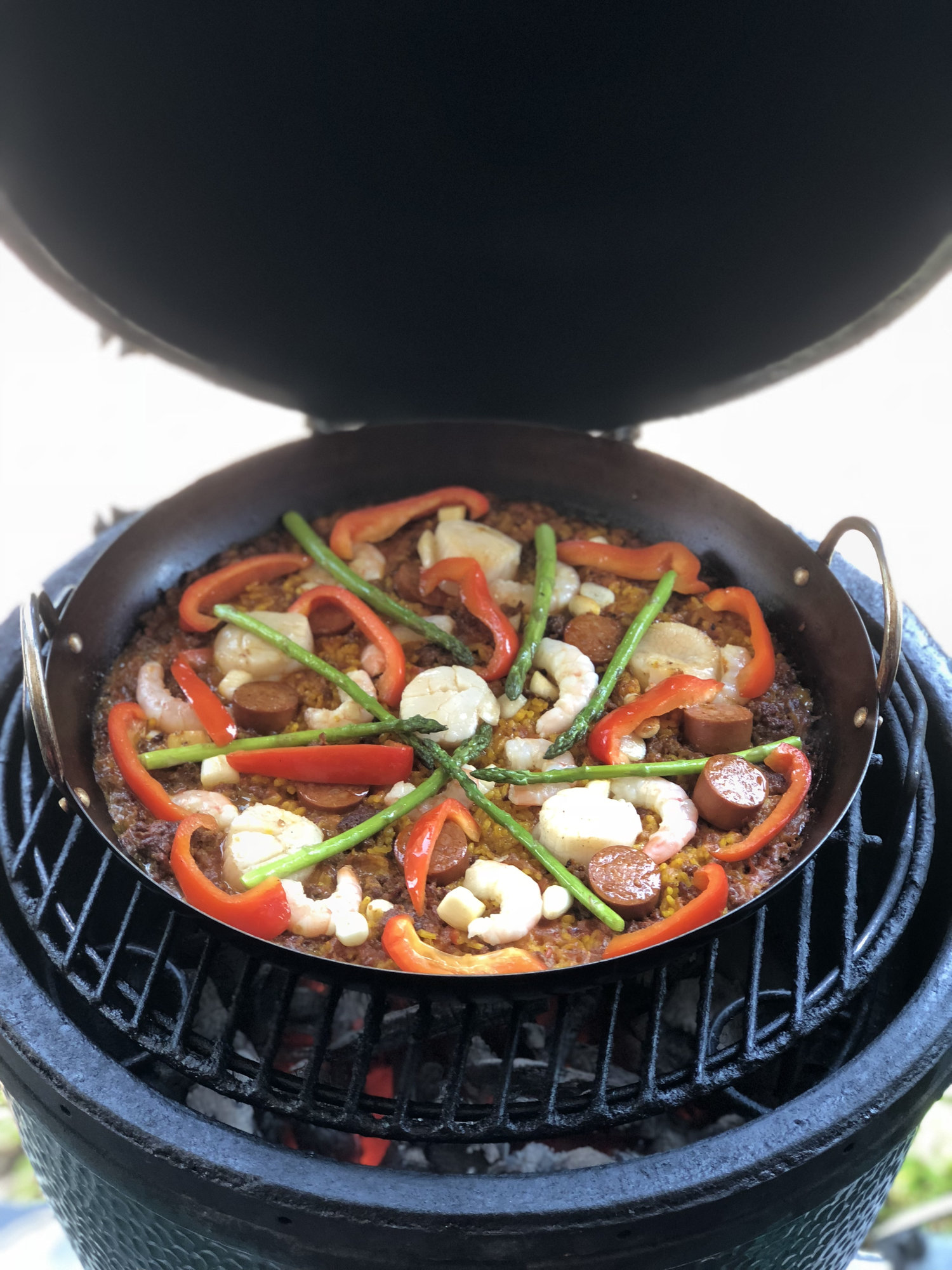 The paella outcome while still on the BGE:  (chorizo, scallops and shrimp).  Was a bit warm working the cook in today's heat but nothing several beers couldn't address.