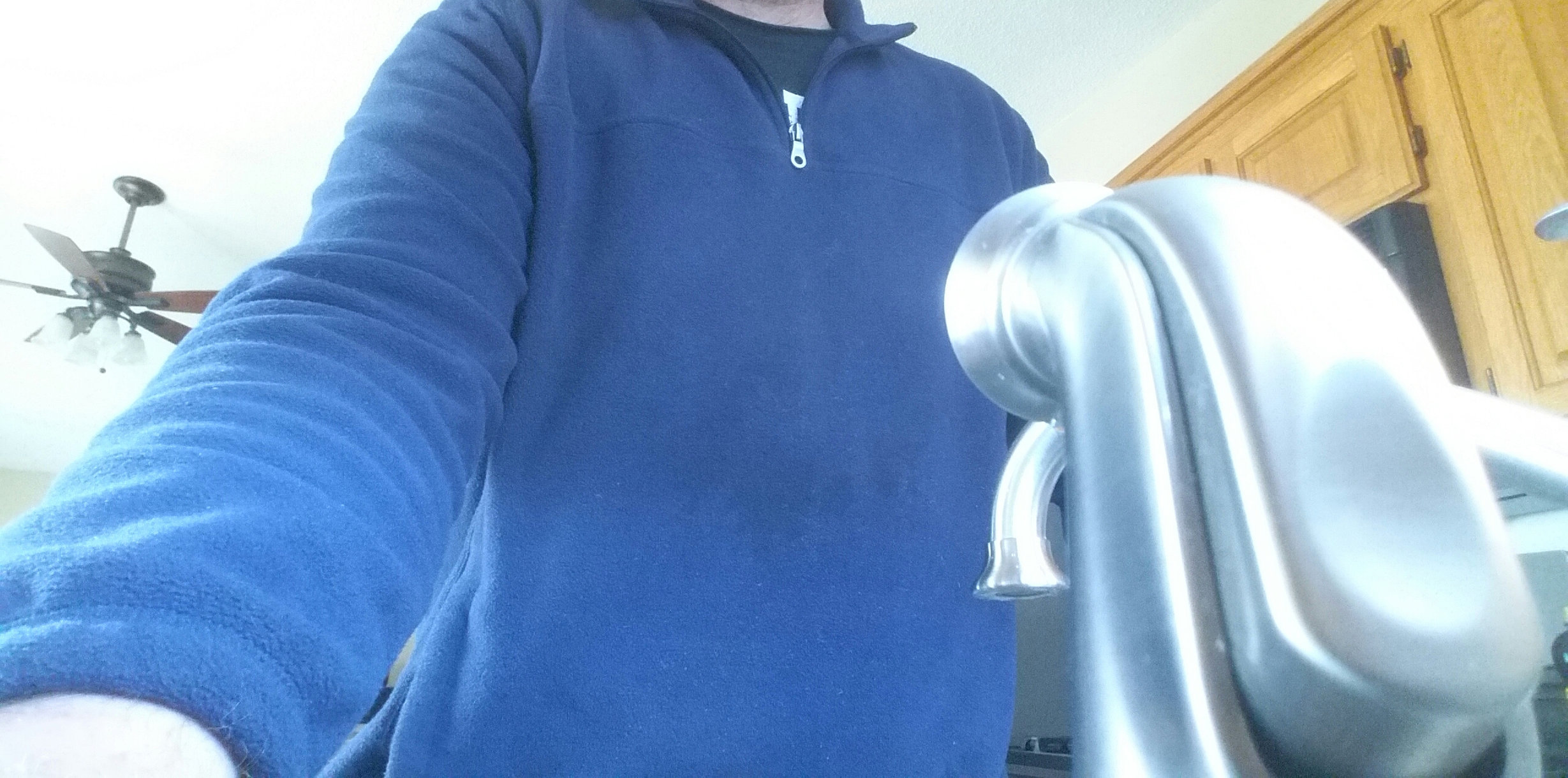 Recreating a photo after getting wet. (My wife thought it would be funny to put rubber bands around the sink spray head before going to work)