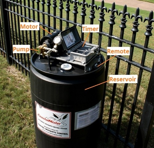 The drum gets filled with water and a half gallon of permethrin concentrate. The drum lasts about 3 months. I rigged it with a float switch so that it sends me a text and email when it’s empty. The permethrin is available from Amazon.