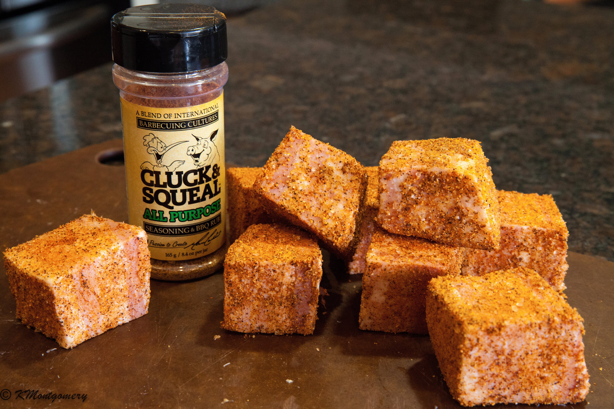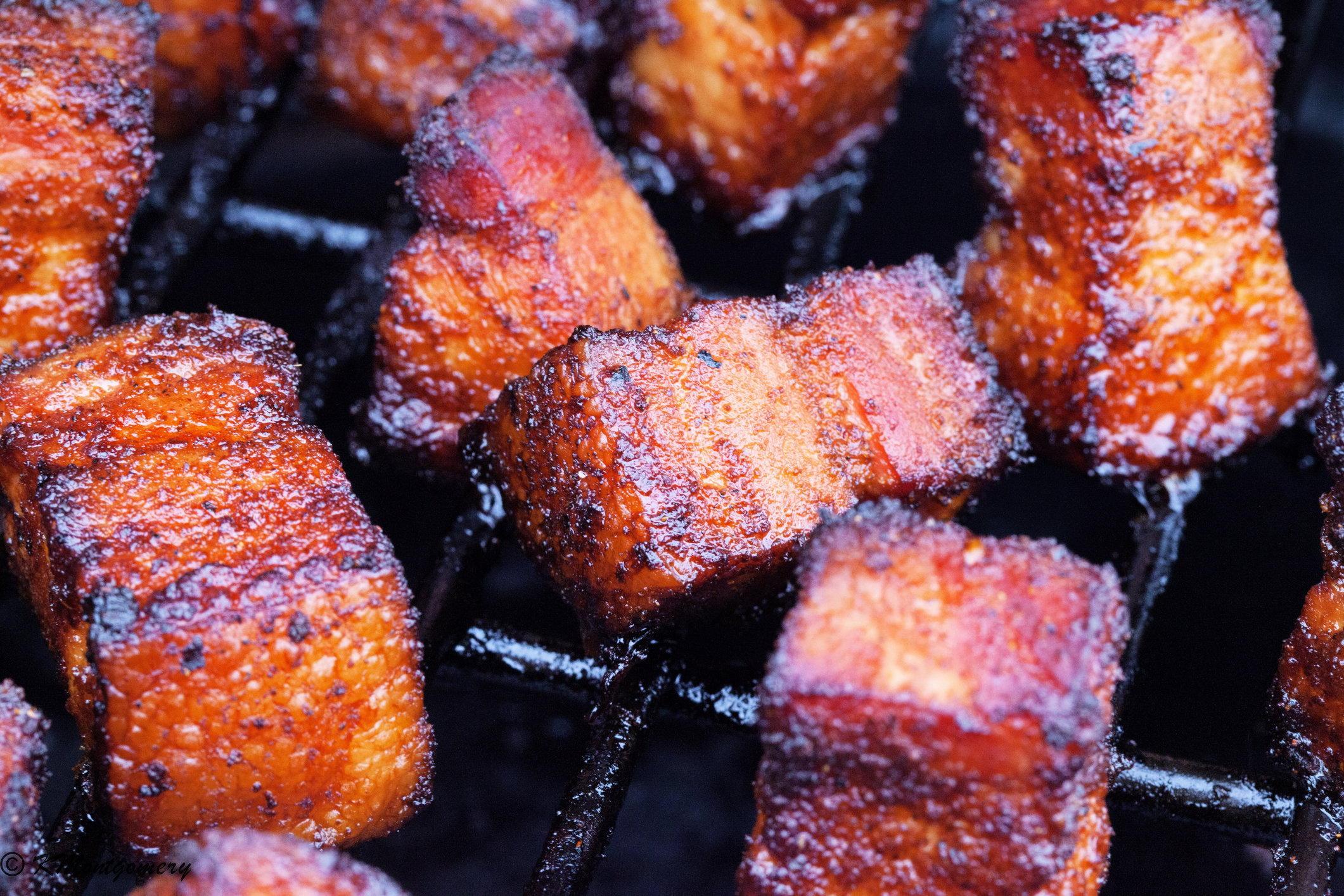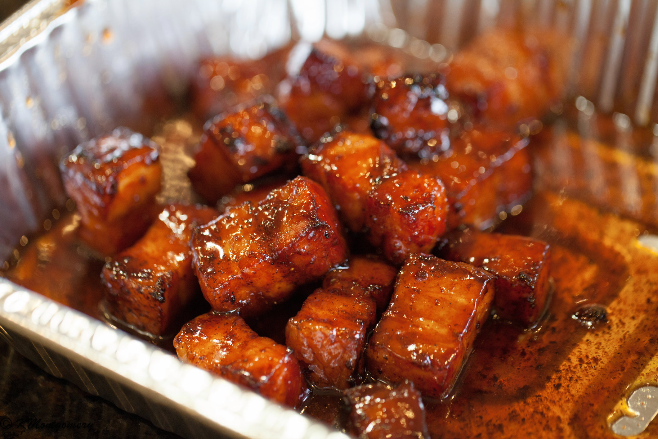 My second attempt at pork belly burnt ends was a nice improvement. Removed the skin and cut up a slab of pork belly into 1" x 1" cubes, rubbed with Cluck n Squeal all purpose and rested overnight in the fridge in a vac sealed bag. Placed on the egg at 250* with pecan and hickory. Cooked for about 2 hours, removed and sauced with fresh honey, brown sugar and bbq sauce. Placed into foil container for another hour or so on the egg and then removed and rested in foil for an additional hour. The guests enjoyed their meat candy appetizer as we sampled cocktails on this hot day.
