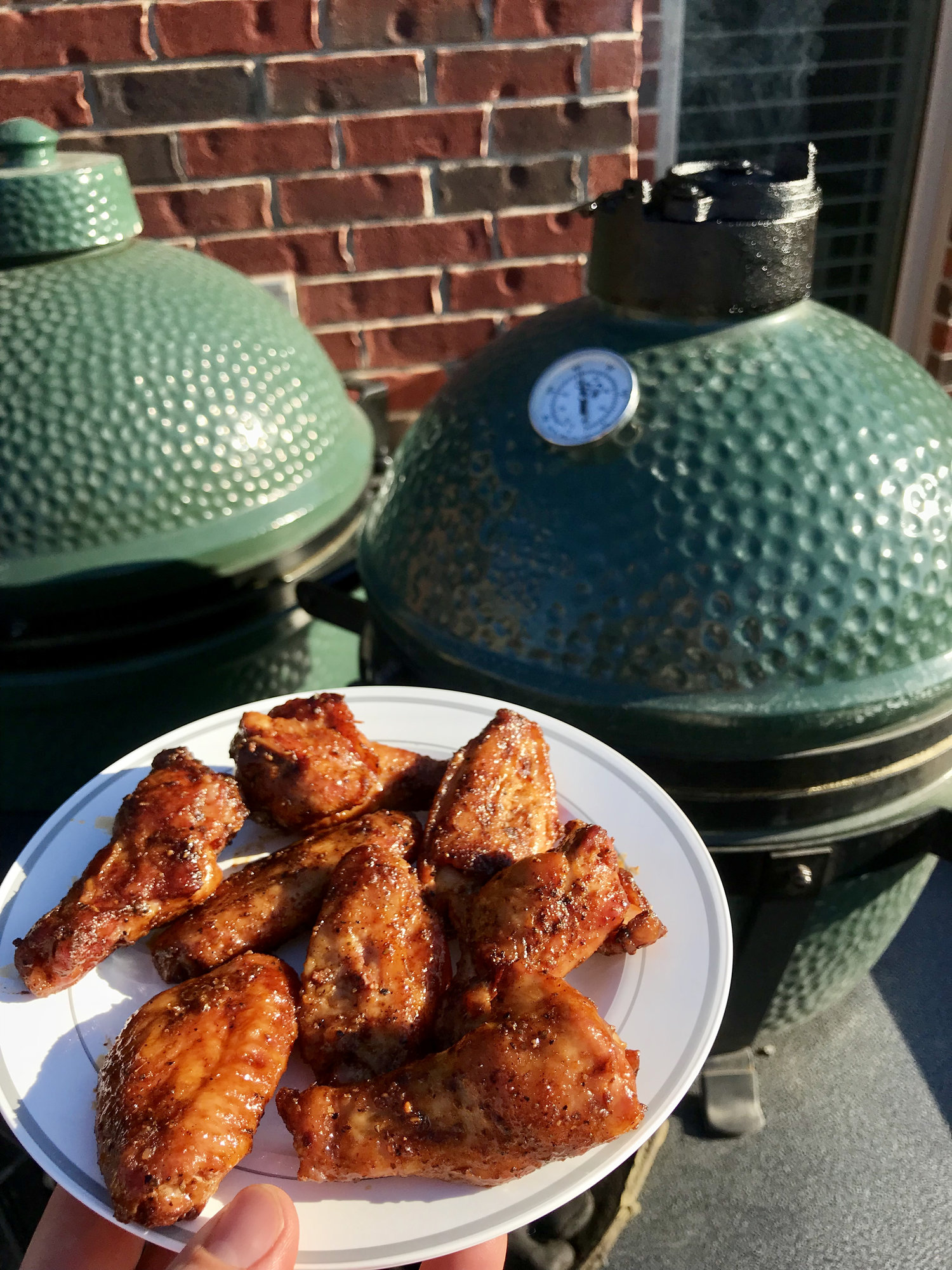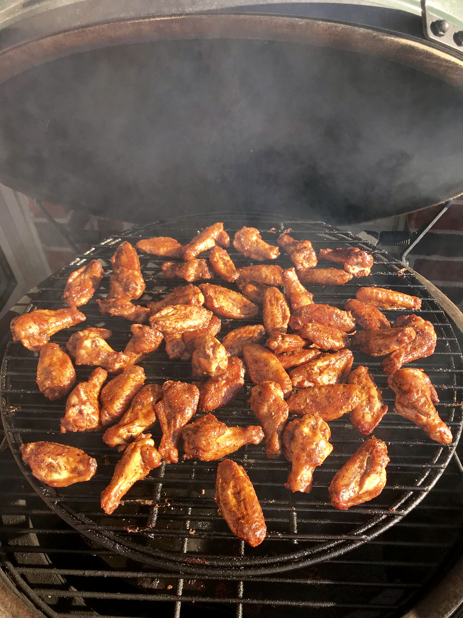 WINGS, seasoned with salt and cracked pepper, Dizzy Pig Crossroads and Swamp Venom, chilled uncovered for overnight in fridge. Went on the top rack of the XL at 400* with hickory and apple smoke for 50 minutes with one flip in the middle. tossed in buffalo butter and placed back on the egg for an additional 10 minutes to set the sauce. They were spicy and crispy.