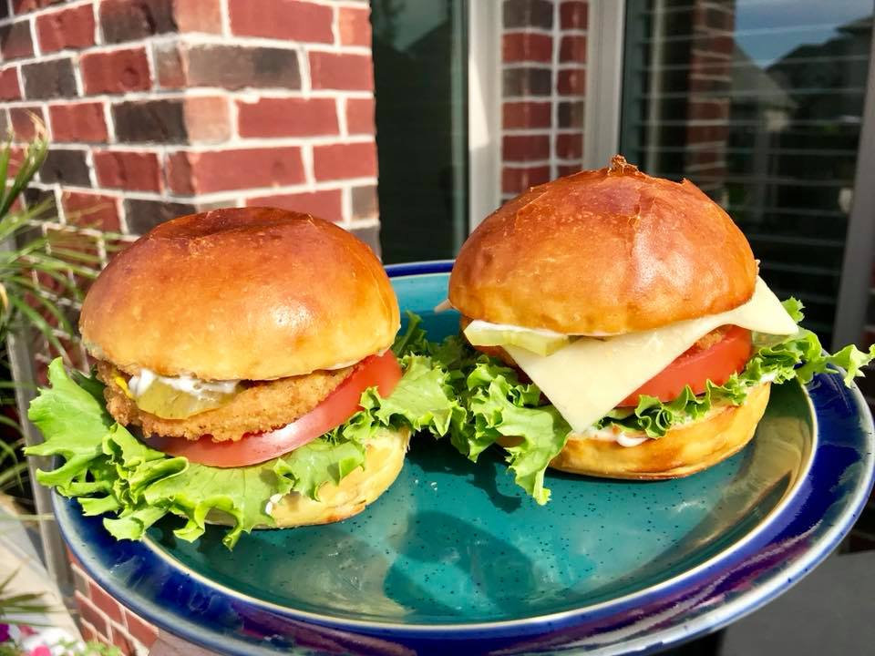 Chicken Burgers, left one is traditional style, mayo, lettuce, tomato, pickle. The one on the right is spiced up a notch with pepper jack cheese, and buffalo butter sauce served up on toasted brioche buns