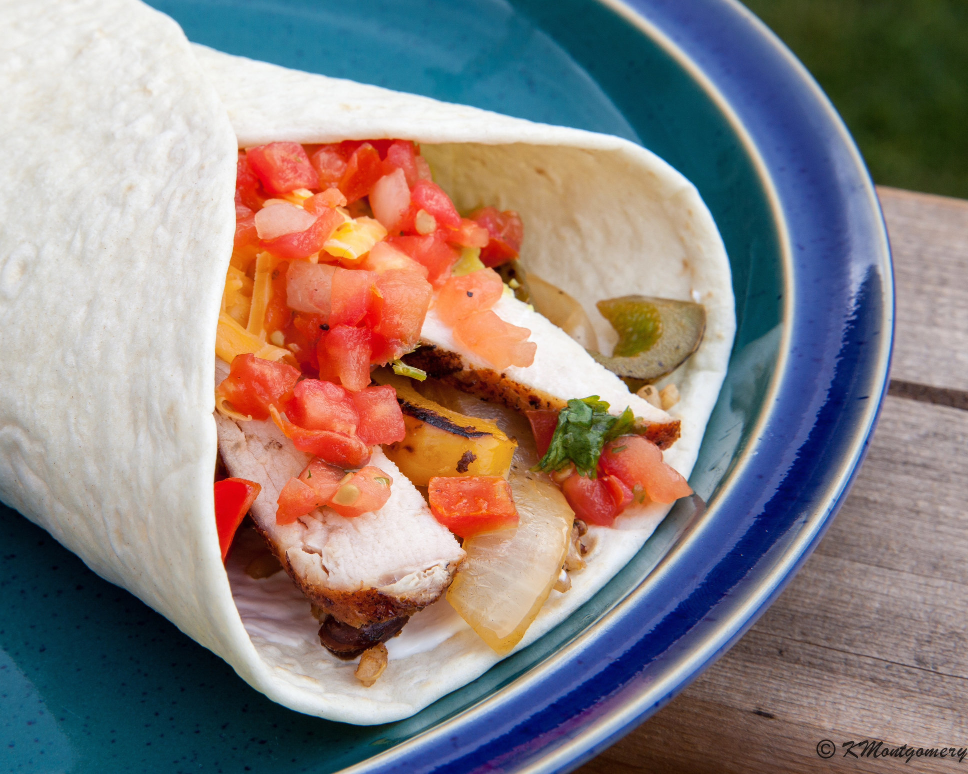 Chicken Fajitas, smoked chicken breast, sautéed onions and peppers, fresh pico de gallo, fresh guacamole, sour cream, cheddar cheese, and Mexican rice