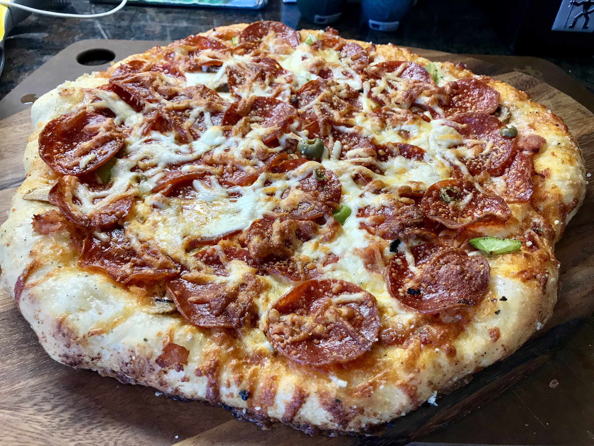 Loaded Pizza with pepperoni, smoked ham, green pepper, fresh mushroom, roasted garlic, mozzarella, green olive and garlic butter brushed crust