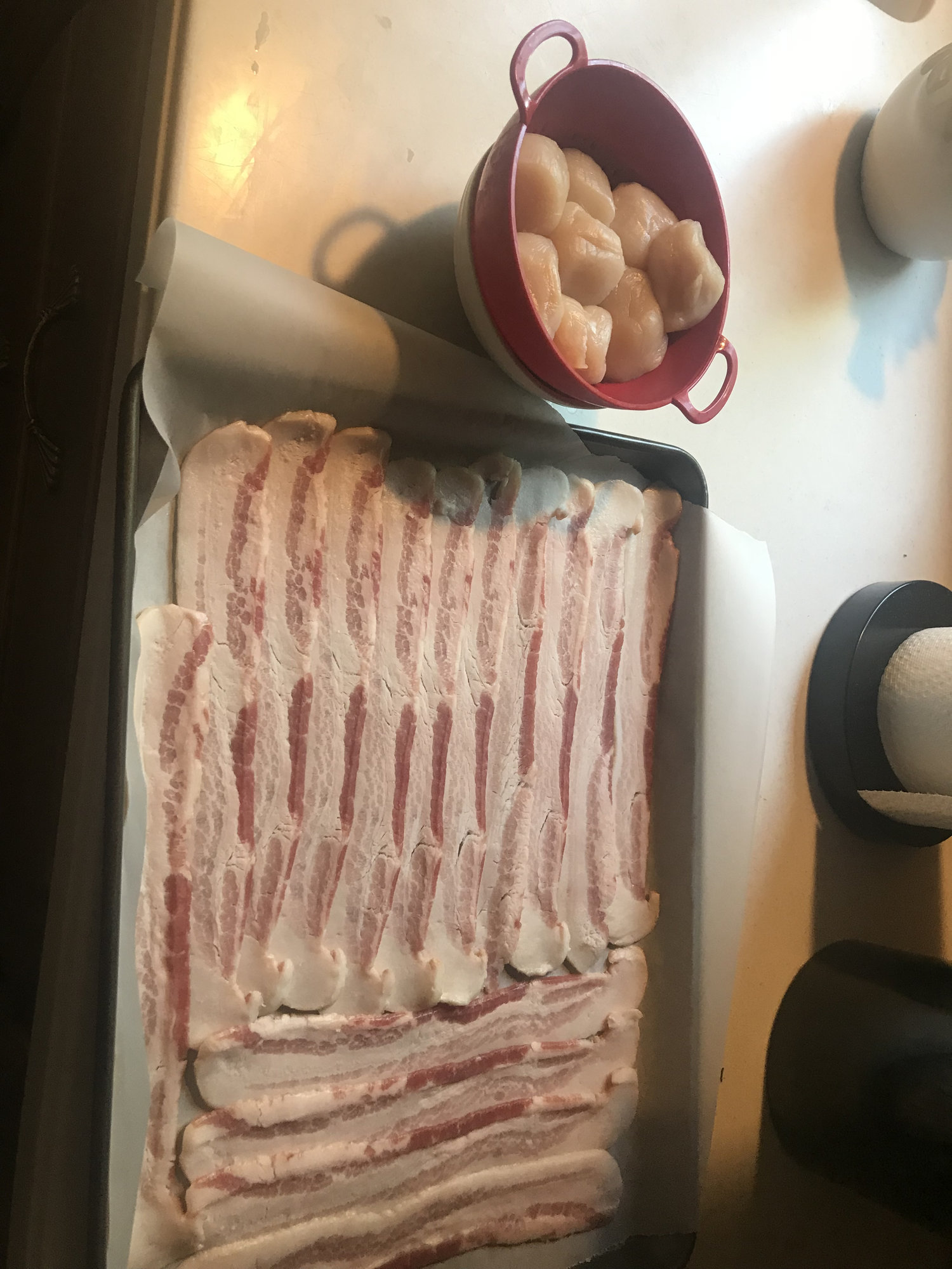 Family is gone again this year. Last year hotdogs this year bacon wrapped scallops.