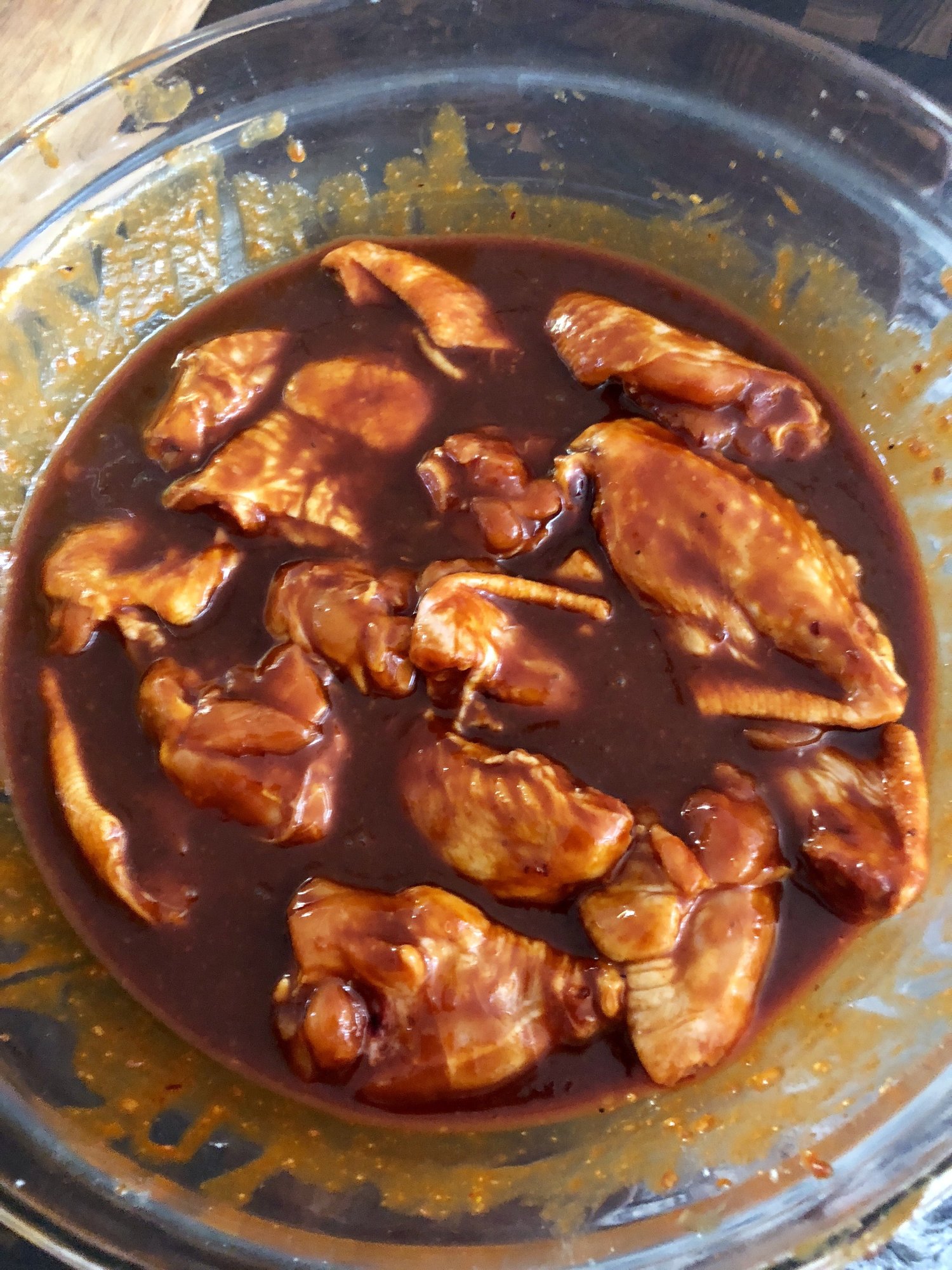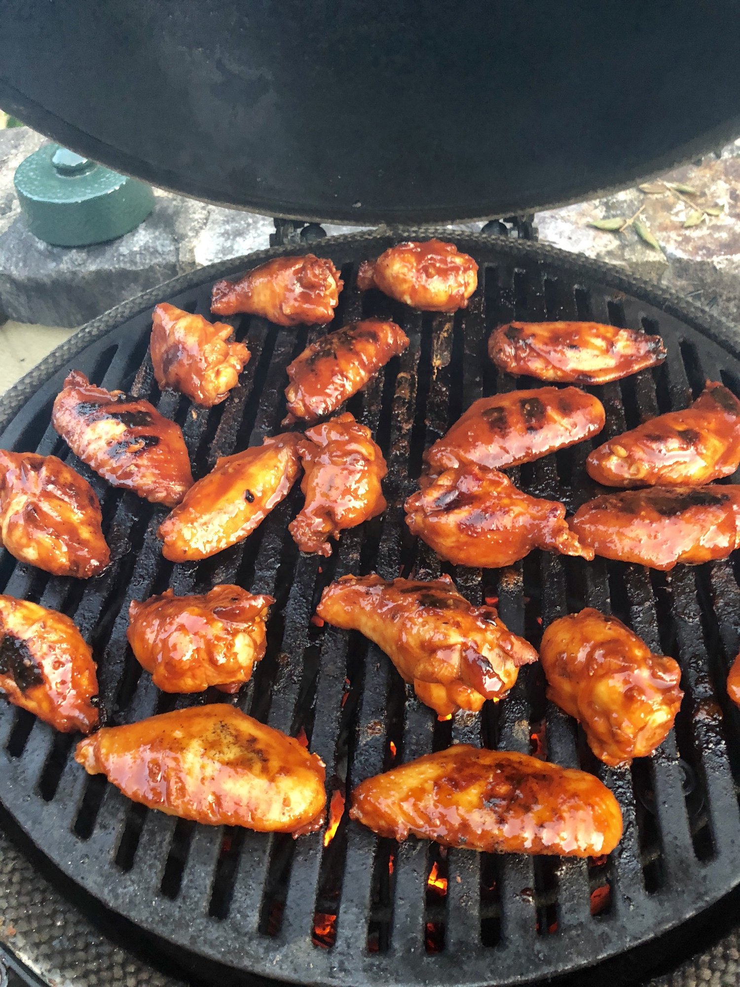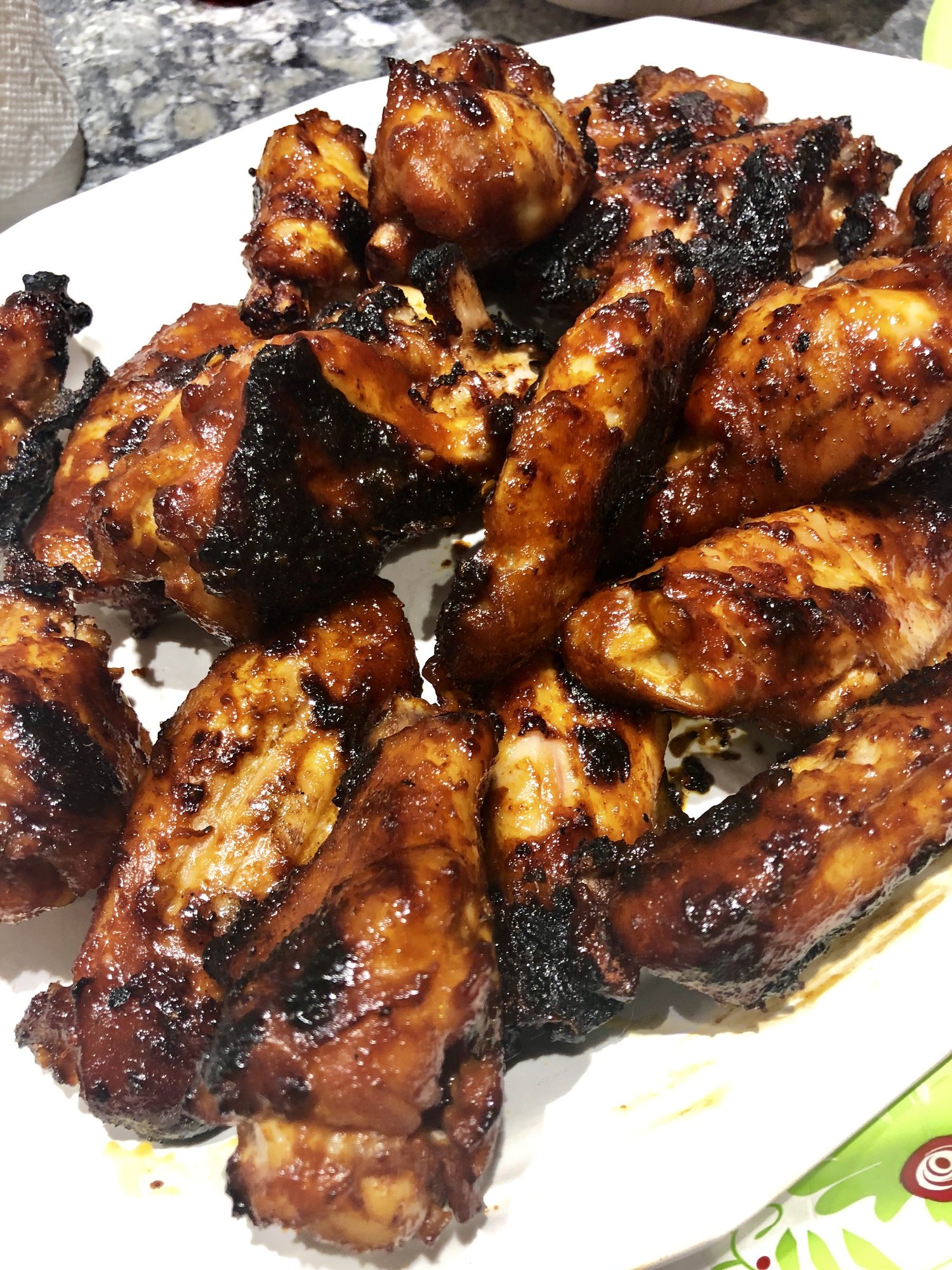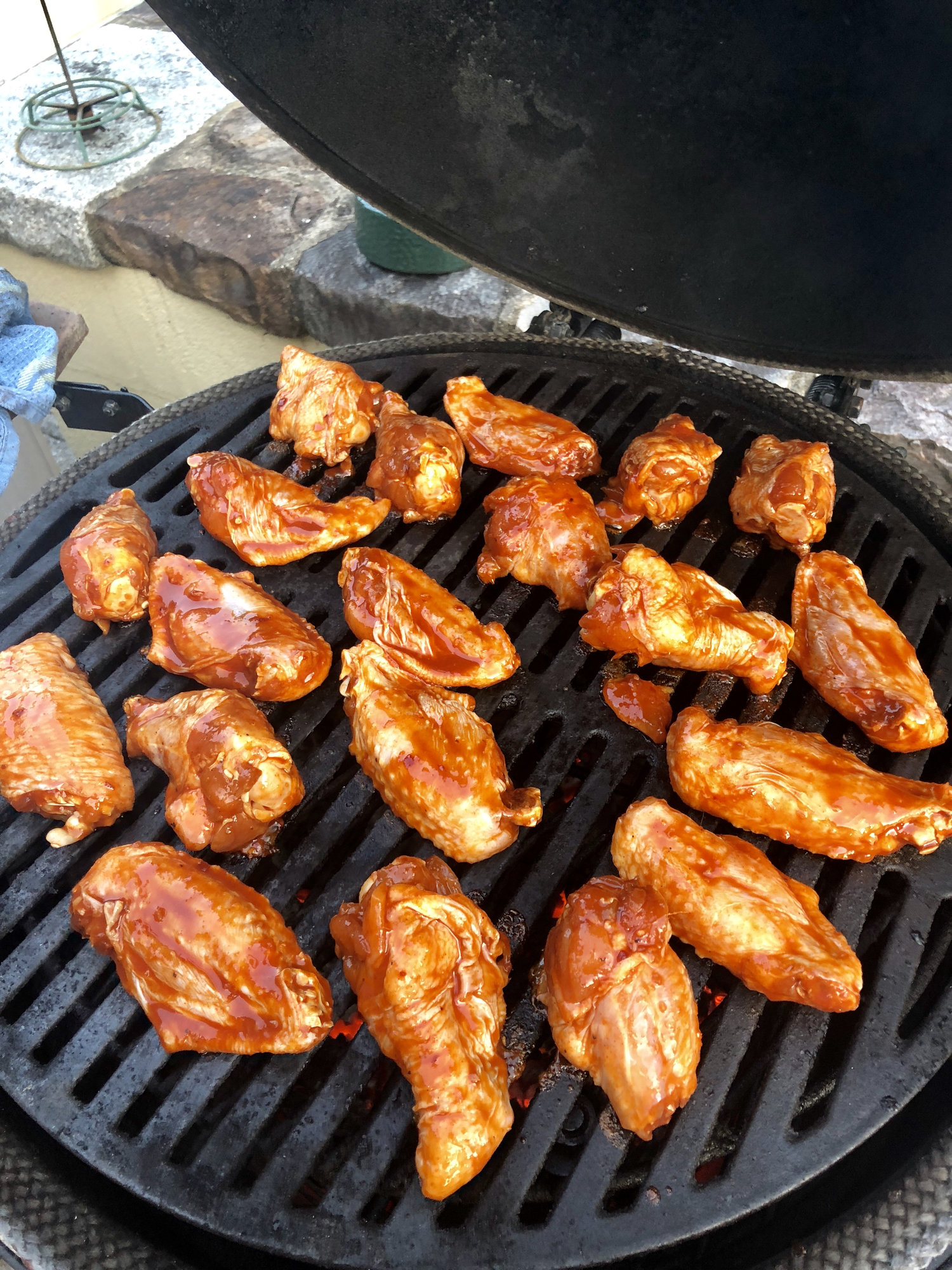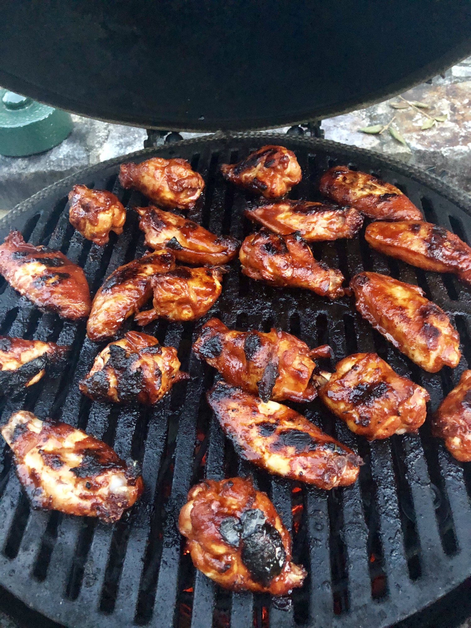 Added to the rich paste some rice wine vinegar, ginger, soy vey chili sauce, and honey to mellow things out a bit. Marinated for 6 hours, grilled on the upper deck on the flat side of the CI grid (mistake — should have used the angled side for less sticking), and periodically removed and rolled them thru the marinade for more sticky-saucy-heat. 45 minutes at 425 or so and done.