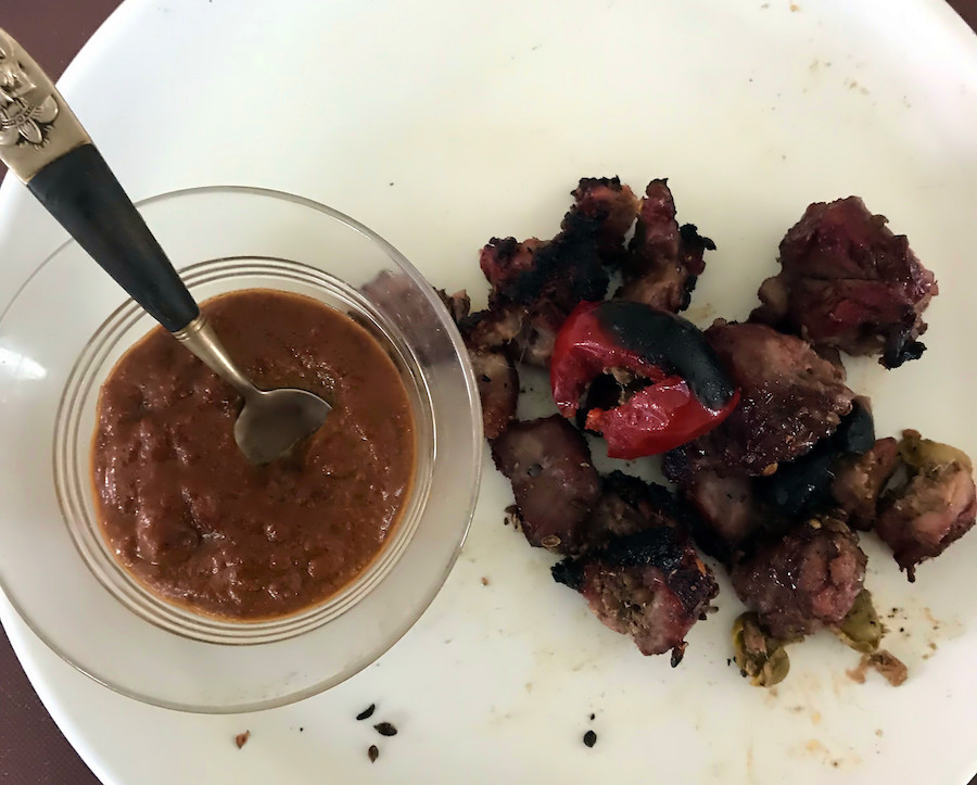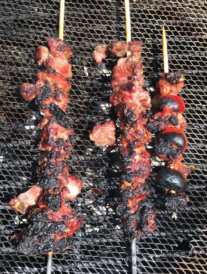 During the annual dome felt replacement, I messed up, and bent the top band badly, tho' didn't drop the dome. Haven't fixed that yet, so I had decided to do the skewers direct, no dome. Today turned out sunny, so lit the lump, and skewered the lamb. Added a purchased item. Oil soaked pepproncini stuffed w. anchovy and caper mash. 89F in no shade, so I went inside. Let it all go maybe 5 min too long. A little too much carbon crunch in places. But the larger chunks of lamb were still buttery smooth.