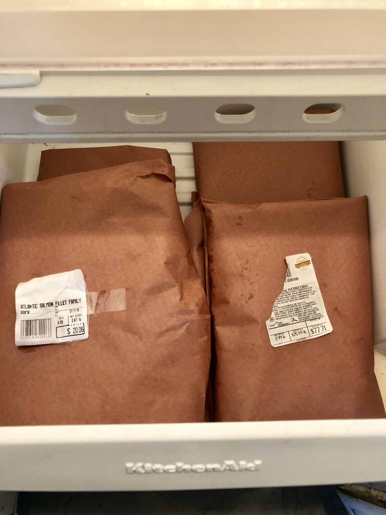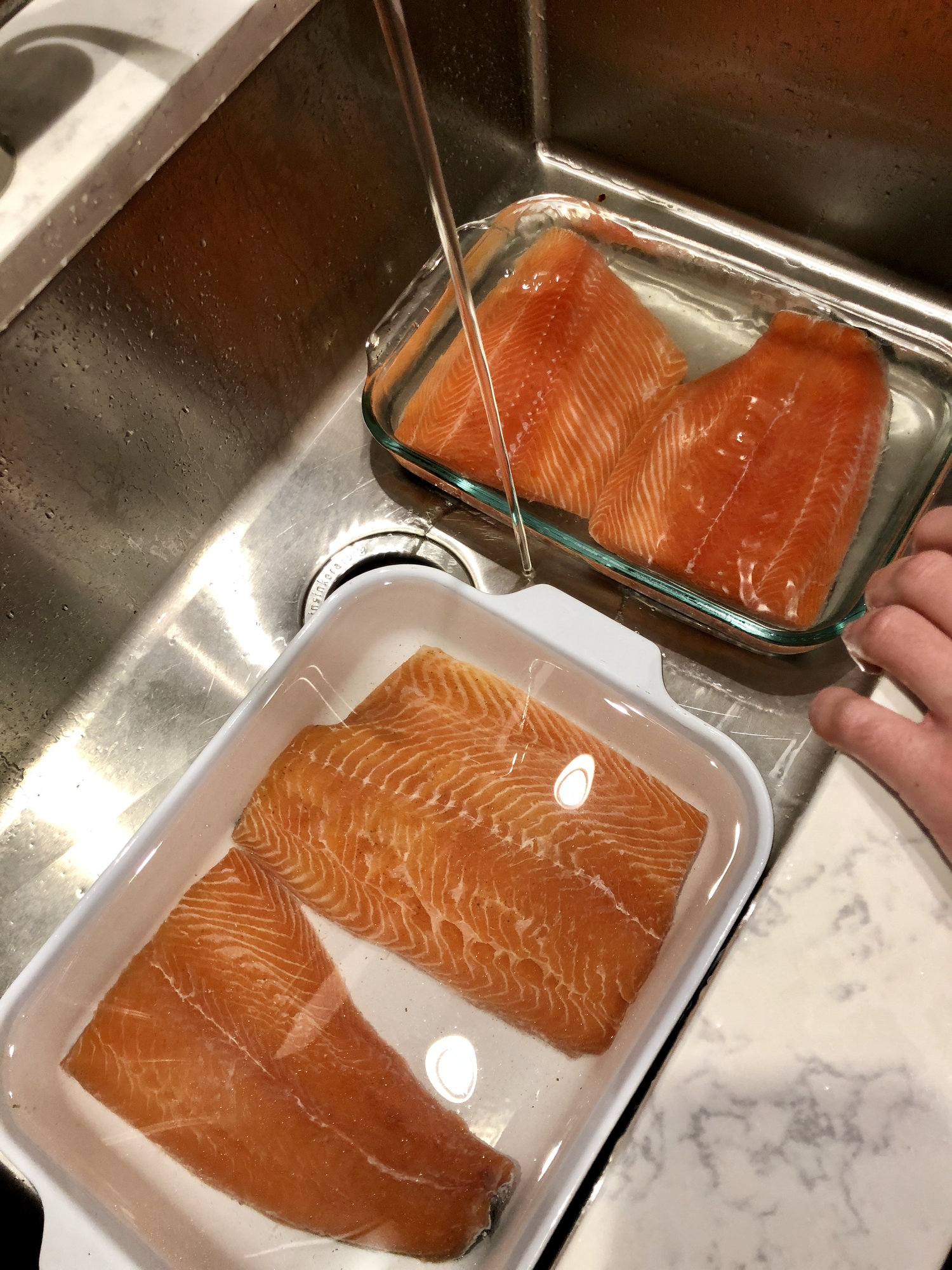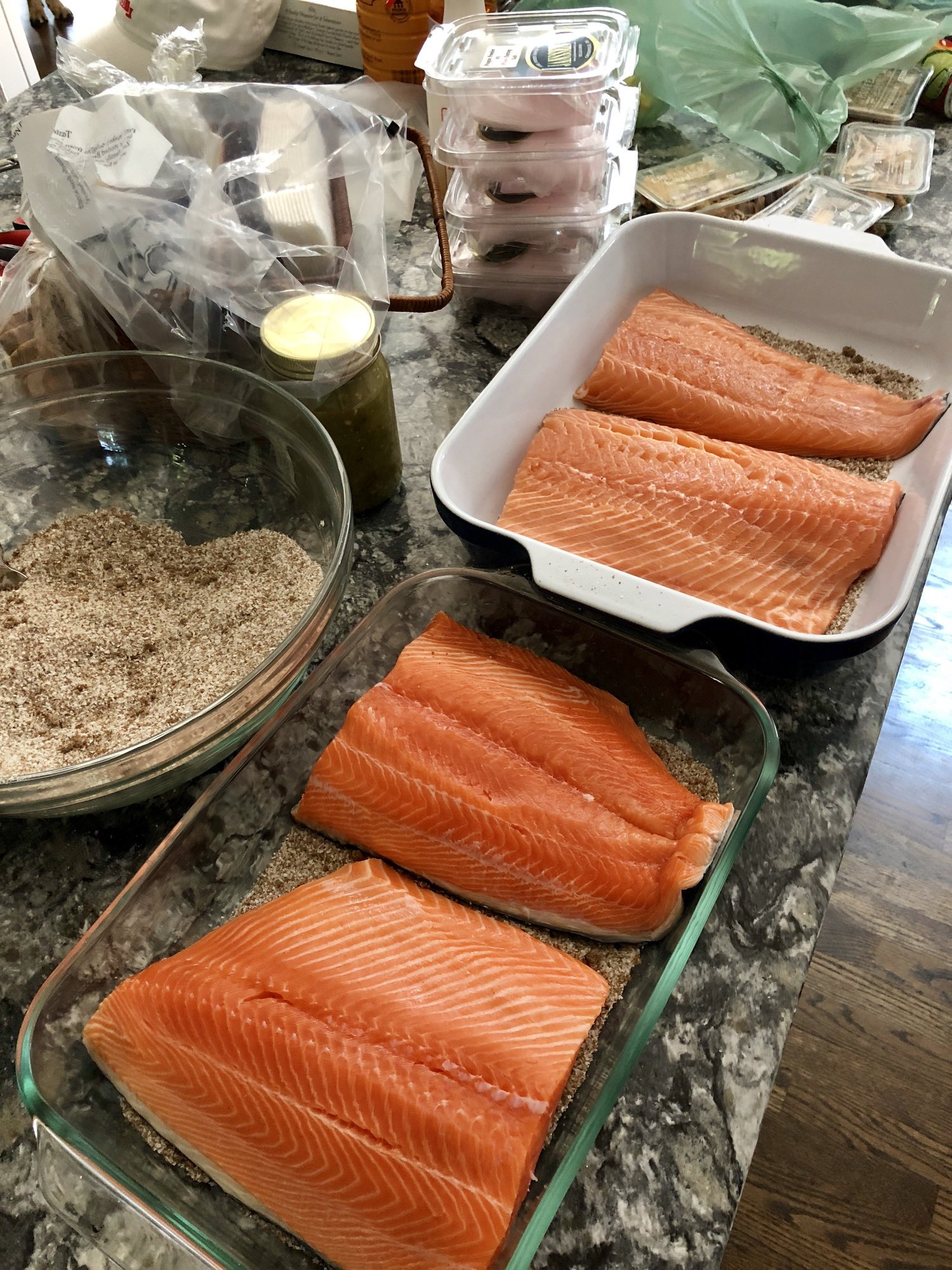6 lbs — 3 of “the good stuff” (wild Alaskan at 25.99/lb) and 3 “el cheapo” (Atlantic at $6.99/lb). It’s resting in parchment + butcher paper in the garage fridge til slicing and side by side comparison. Pix out of order, of course ...