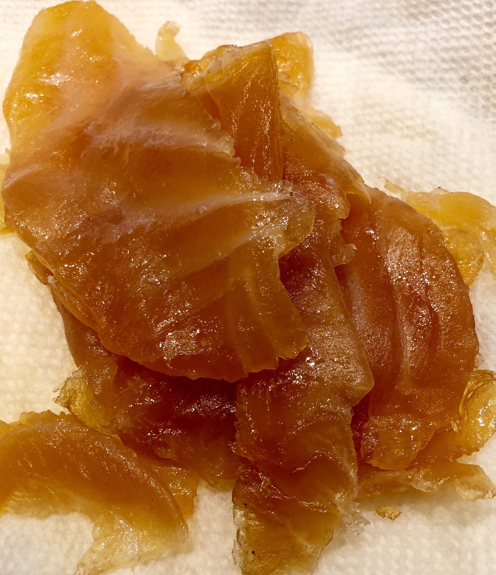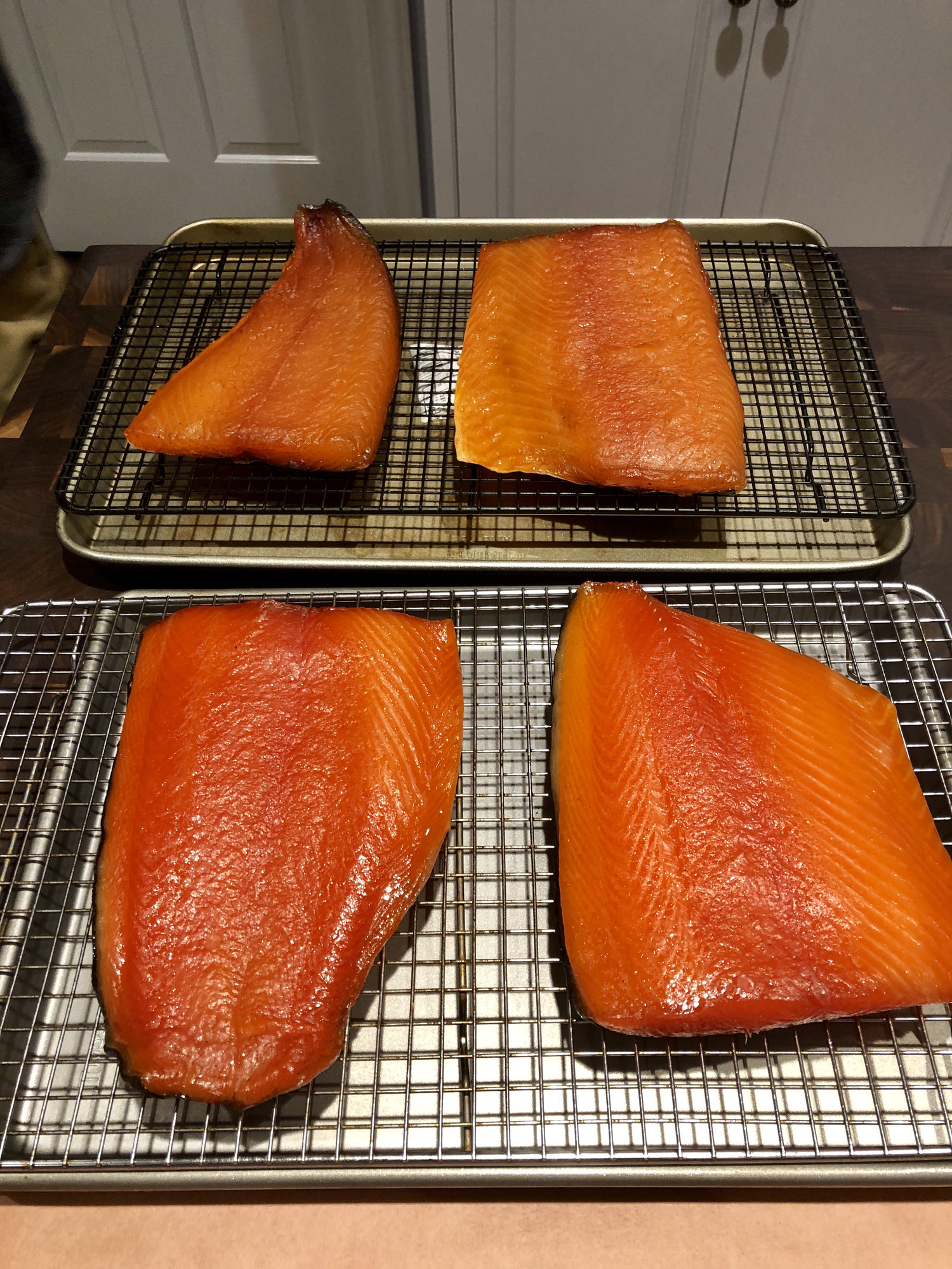 After that, the fillets get a very good rinse before sitting again in the fridge until a pellicle forms — 24 hours or so, but more time won’t hurt anything. At that point it’s “lox” and ready to slice and eat, although we don’t because we are making nova, which is cold smoked.  Cold smoking in the mailbox on 2 levels, with the temp always under 90 degrees — we control the temp by distance between the egg and the mailbox. Sometimes we do a light smoke (less fruit wood, less time) and sometimes it’s more heavy. Last night we got into a few beers and some rum and cigars, and let the time get away from us, so it’ll be a heavier smoke. That gets tempered a bit by how long I let it sit in the fridge to mellow out -- a week or 2 is fine, although I typically change out the butcher paper if it's moist and get's wet or sloppy.  Last step is slicing thin (which I’m getting better at each time), weighing out and vacuum sealing. Yield runs about 1/2 lb nova per pound of salmon. As a special treat (and to push the yield a bit higher), we make “Japanese bacon” by slicing up the skin, brushing on a bit of soy vey or teriyaki sauce and firing it up in the toaster oven — it’s delicious!