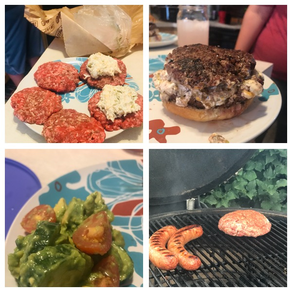 We mixed the cream cheese cheddar and chopped peppers together to stuff our patties. We made 6 thin patties and spread it on one of the patties and then sealed a second one over the top. We cooked these at 500ish until medium. Served with a side of maple Bourbon sausage and avocado cucumber salad. The salad was dressed with a few fresh limes and some evoo. Nothing to fancy but was a good meal and even better time cooking with my Norah Grace.