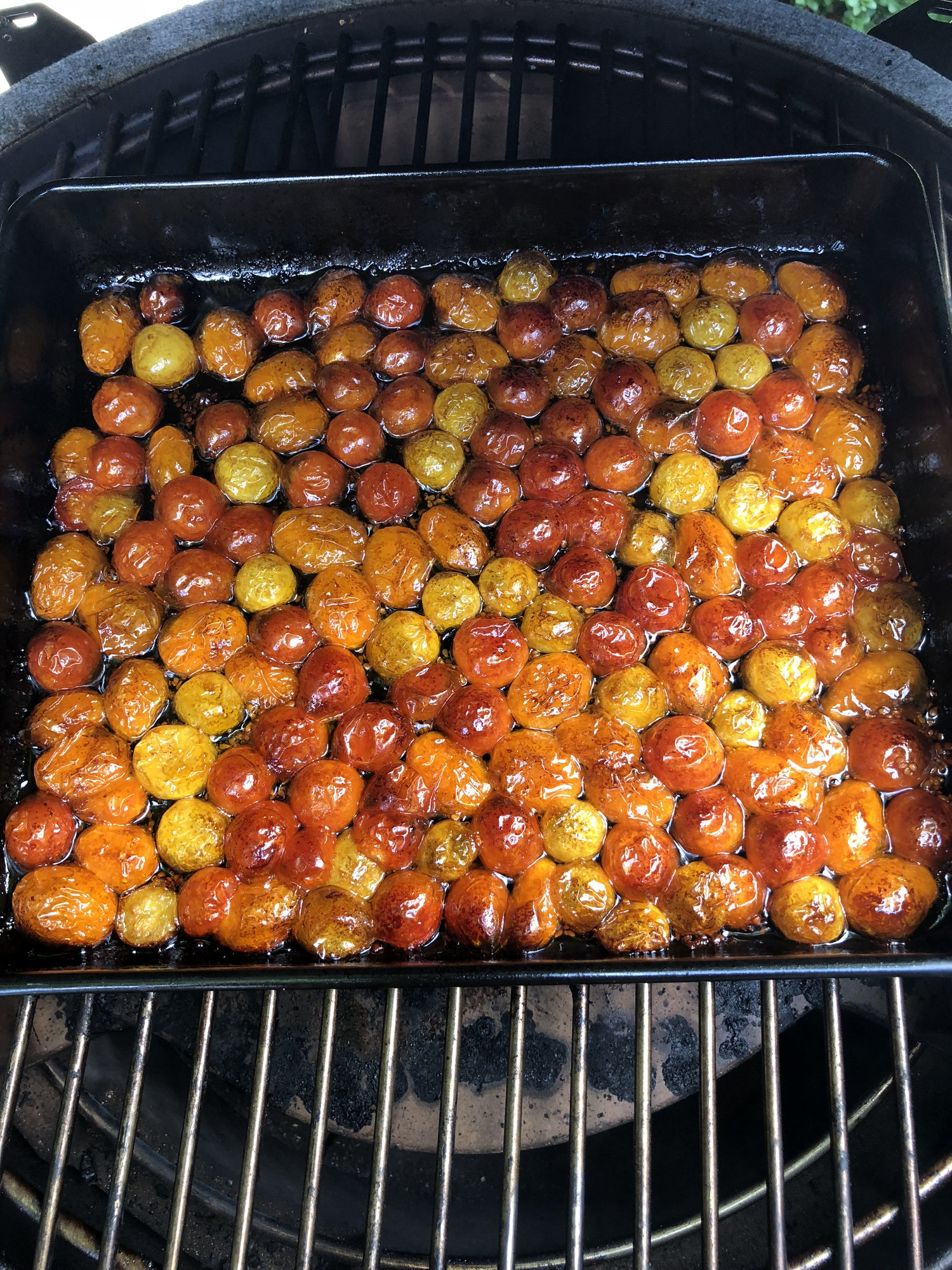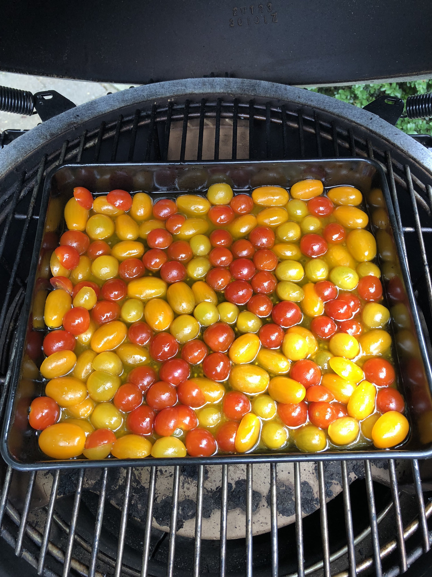 but did them on the BGE yesterday. Result was much better, with the tomatoes taking on a nice smoky flavor and look with more carmelization. Tomatoes were tossed with olive oil, honey and garlic salt before roasting.