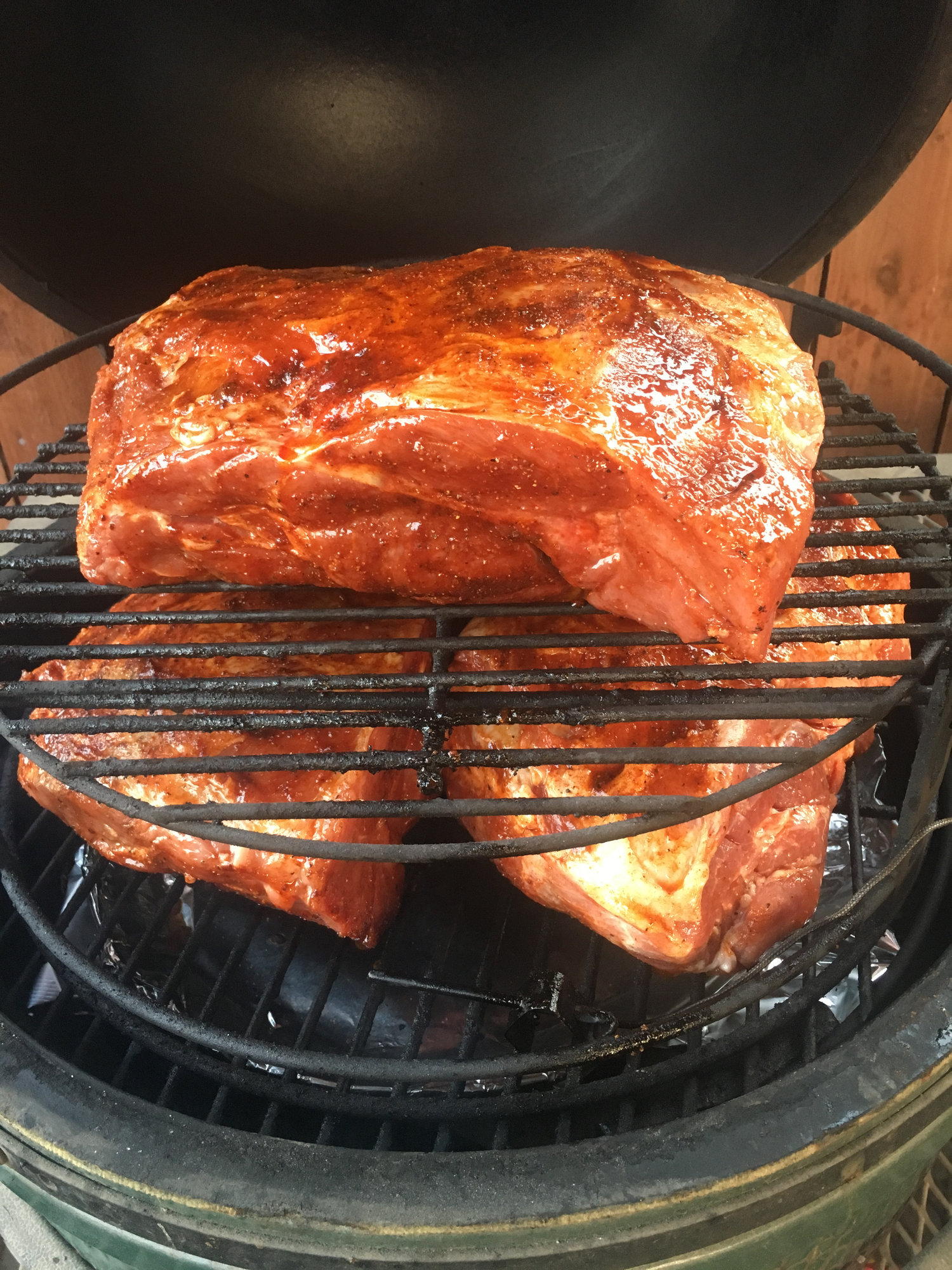 They needed 60 lbs of pork butt for pulled pork Sammie’s. My LBGE could only handle half that, so another one of her co-workers husband volunteers to do the other half on his Traeger