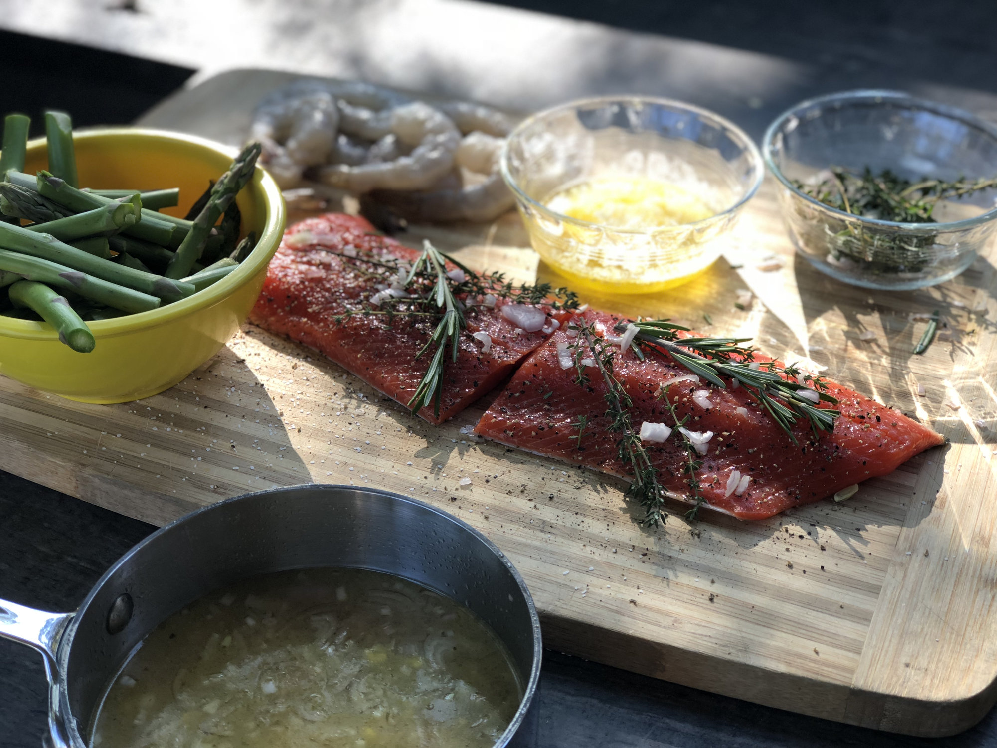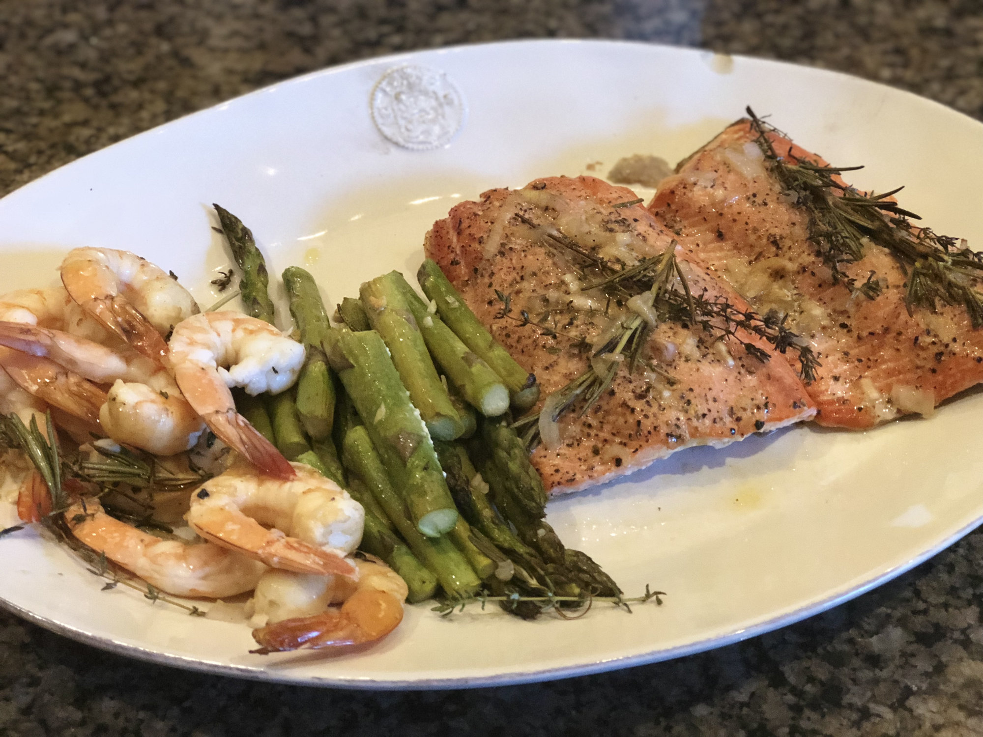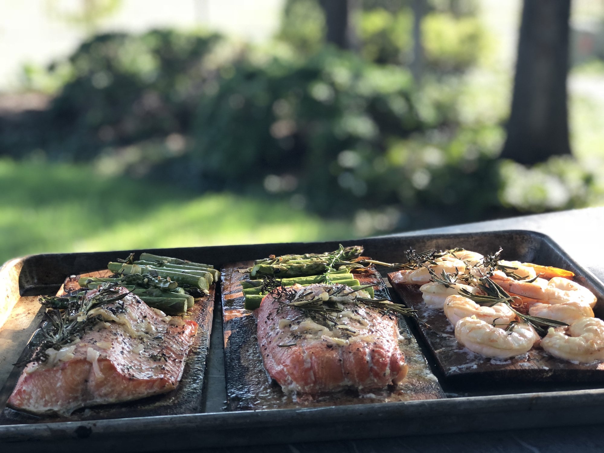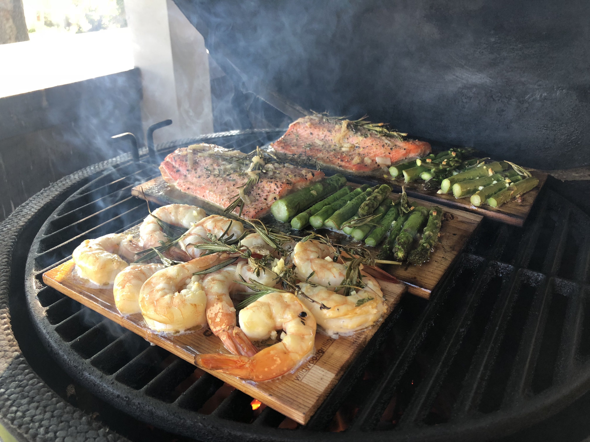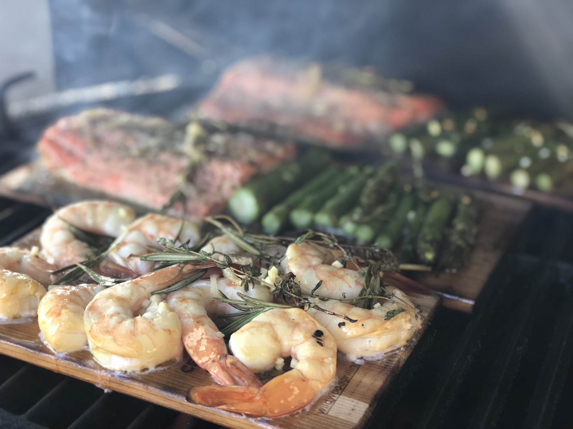 Planked Salmon, Shrimp and Asparagus. Shrimp was brined, brushed with a mop of butter, olive oil, garlic, lemon juice, shallots, etc. Added some Rosemary and Thyme on top. Soaked planks for an hour, preheated for 5-10 minutes, flipped, added the food. 425 or so, raised direct, 15-20 minutes..