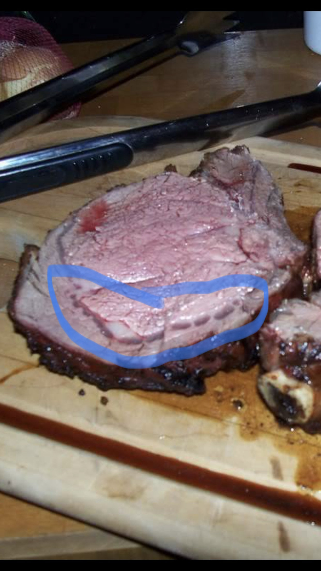 I’ve seen ribeye from Costco with these harder parts in it, typically toward the end of the primal. What exactly are these things, which I’ve zoomed and highlighted in blue?