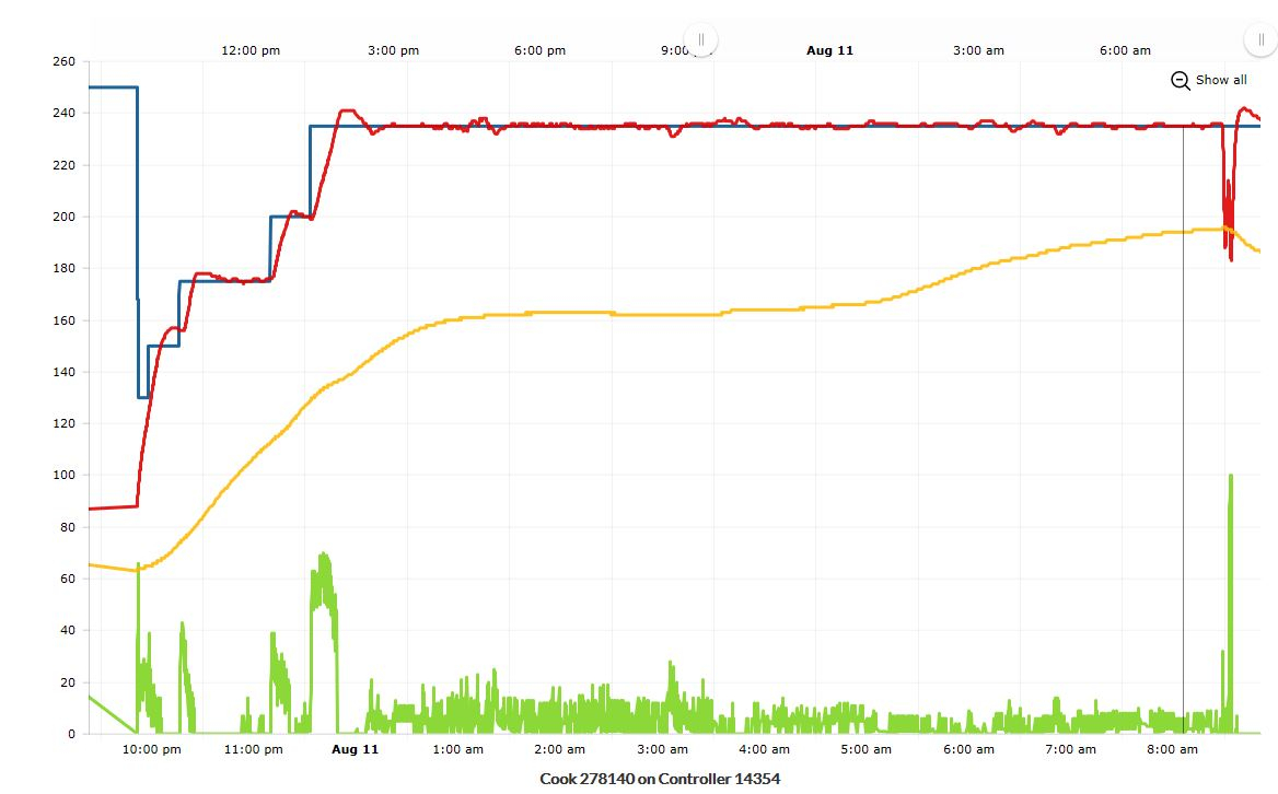 It was at 160F within three hours, then sat there for four hours in the stall, before creeping up to 200F in the last three hours. If I would have put it in cold, it would have taken another hour or so.