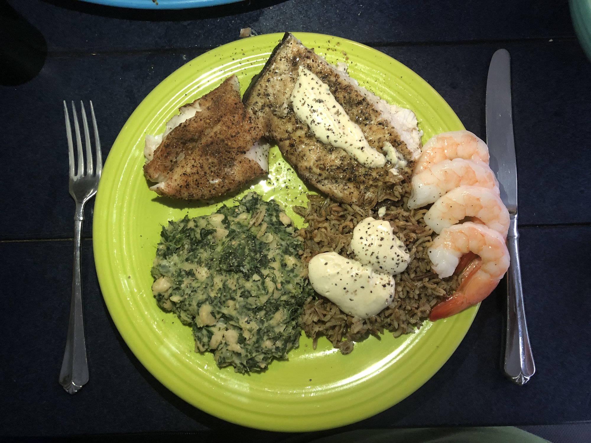 With cannellini bean and spinach purée, wild rice and shrimp cocktail.