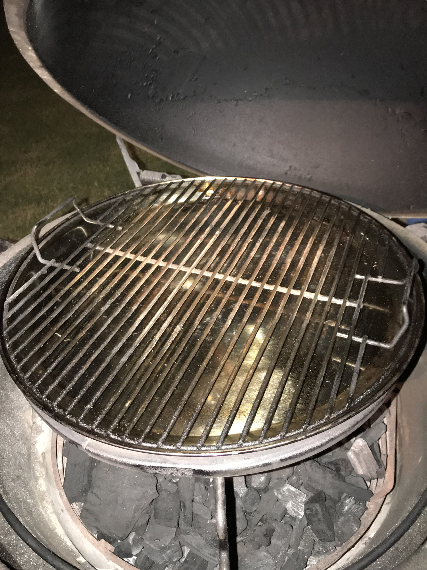 I prefer this method for low and slow so I can see a visual on the charcoal and add wood chunks or stir existing ones up with extreme ease. Don’t have to mess with the grates.