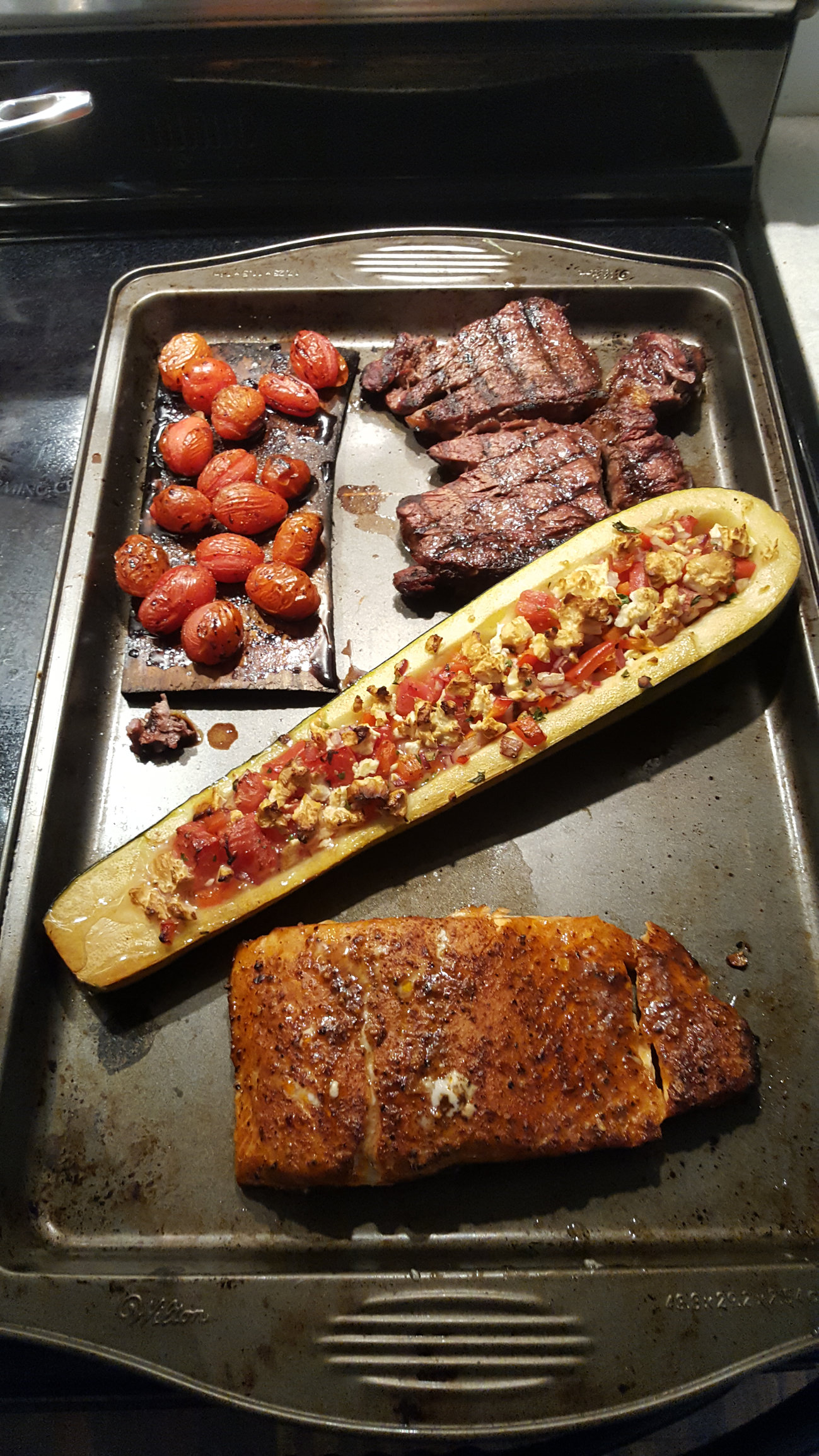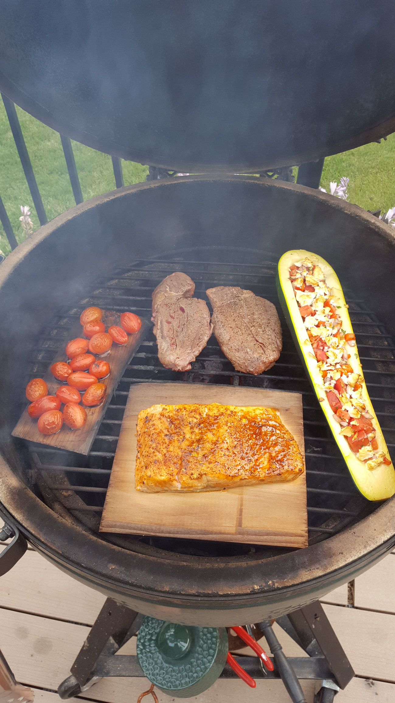 Trout and tenderloin steaks. With stuffed zucchini boats.