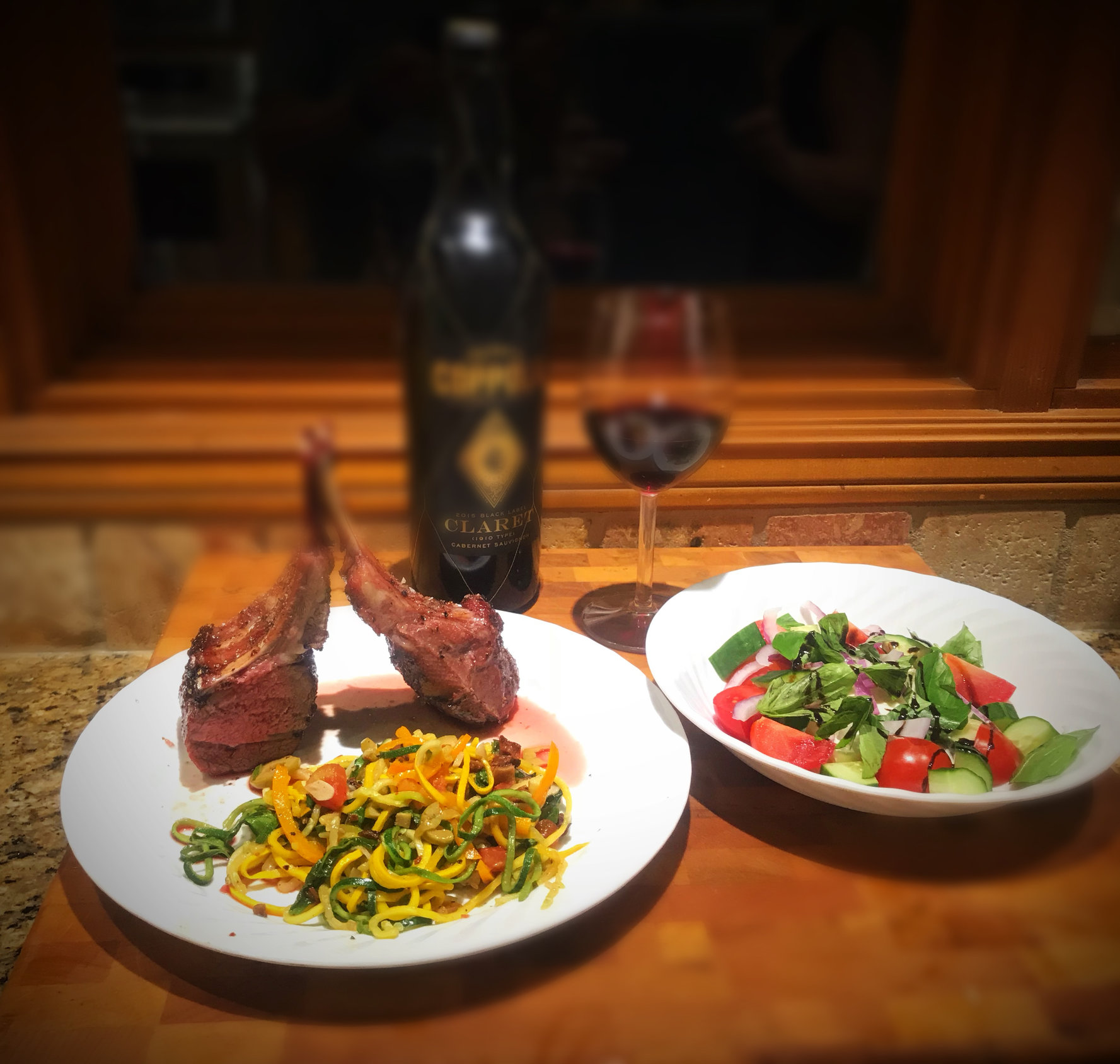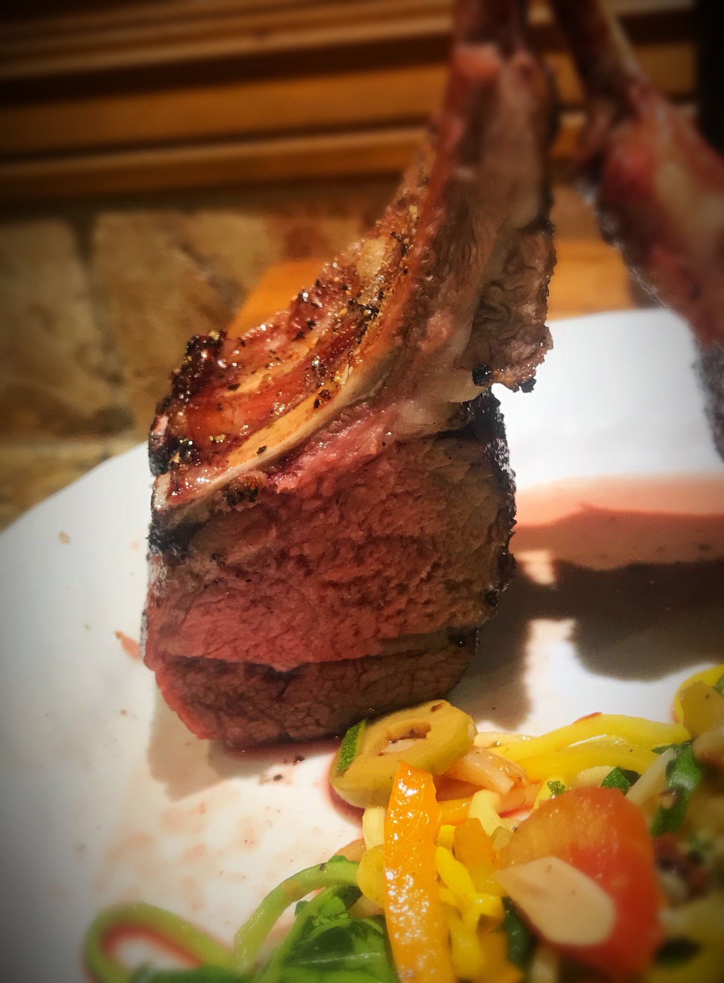 Rack of Lamb SV with zucchini pasta and caprese salad