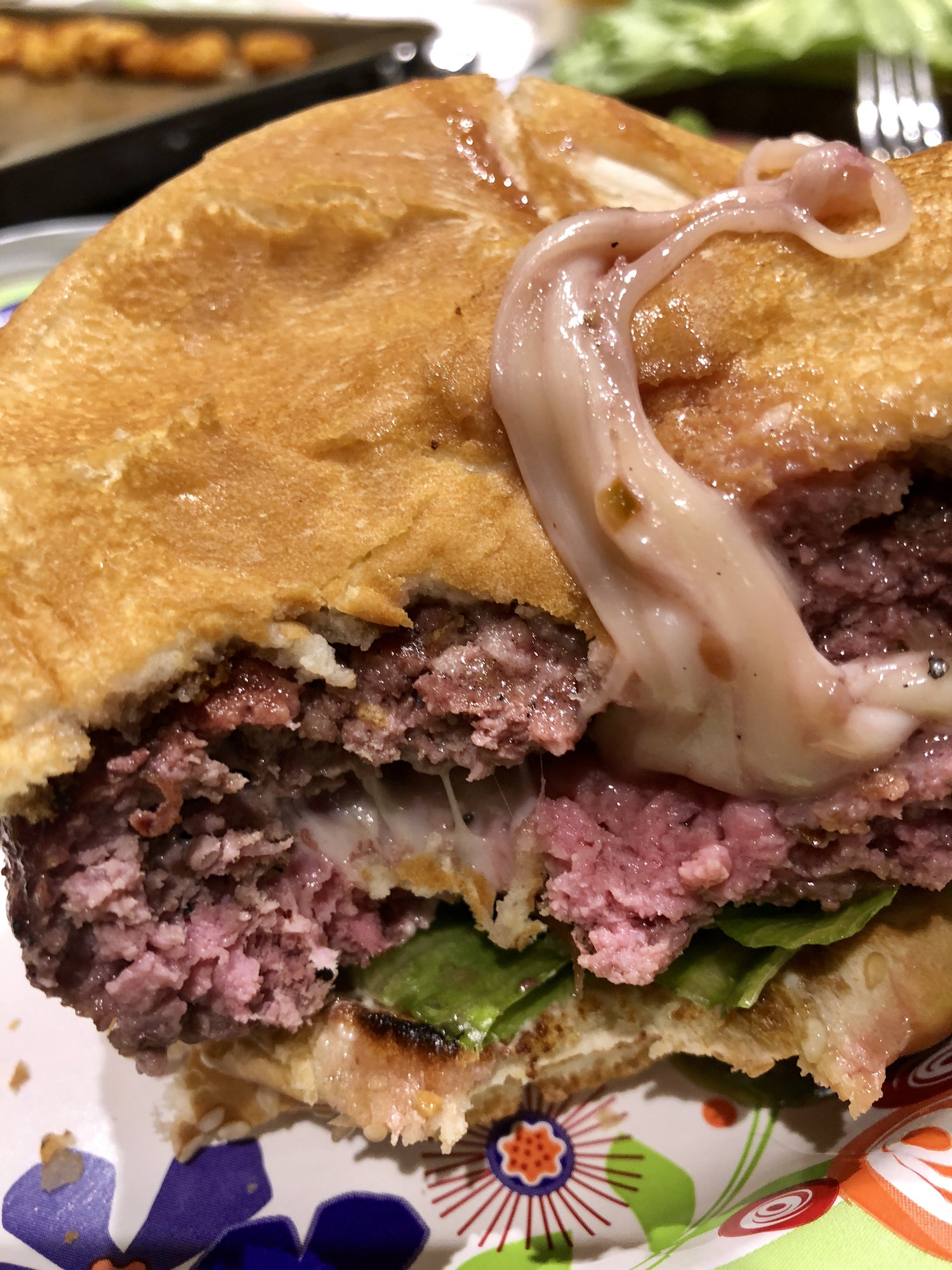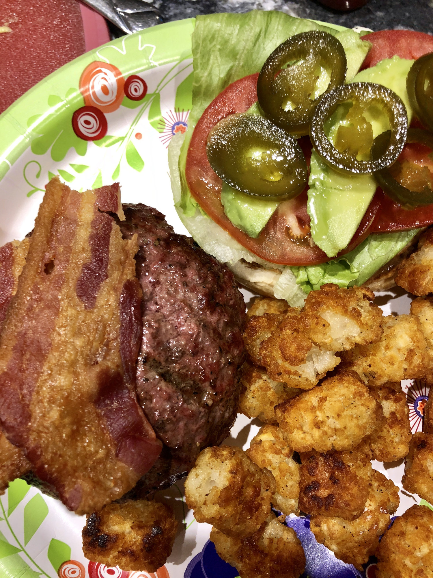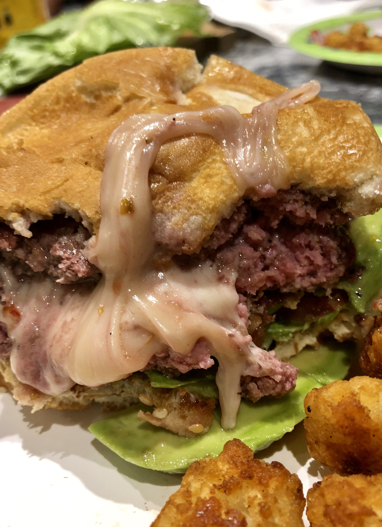 First bites resulted in literal juice explosions, which was a first. Maybe I didn’t rest long enough? Meat was a brisket/chuck 80-20 combo from Trader Joe’s. Cheese was pepper jack. Toppings included Dukes, iceberg, tomato, freesh avacadoo, bacon, and sweet-hot jalapeños. And tots. Always tots.