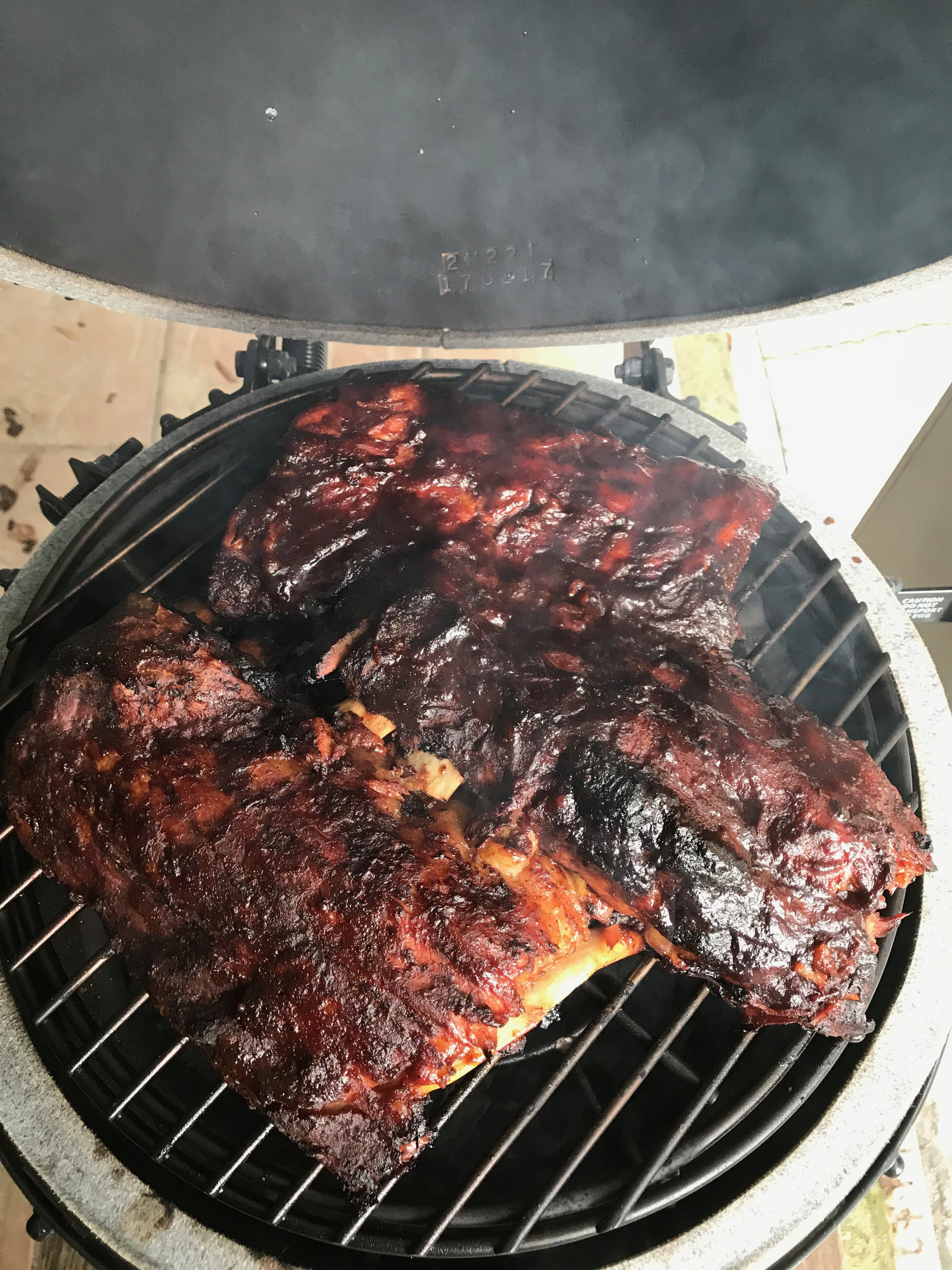 Three half racks onto the MMX for 30 minutes. Rubbed them with Blues hog before going on the egg and then at the 15 minute mark. Pulled them and foiled them to rest while I did the other three half racks the same way.