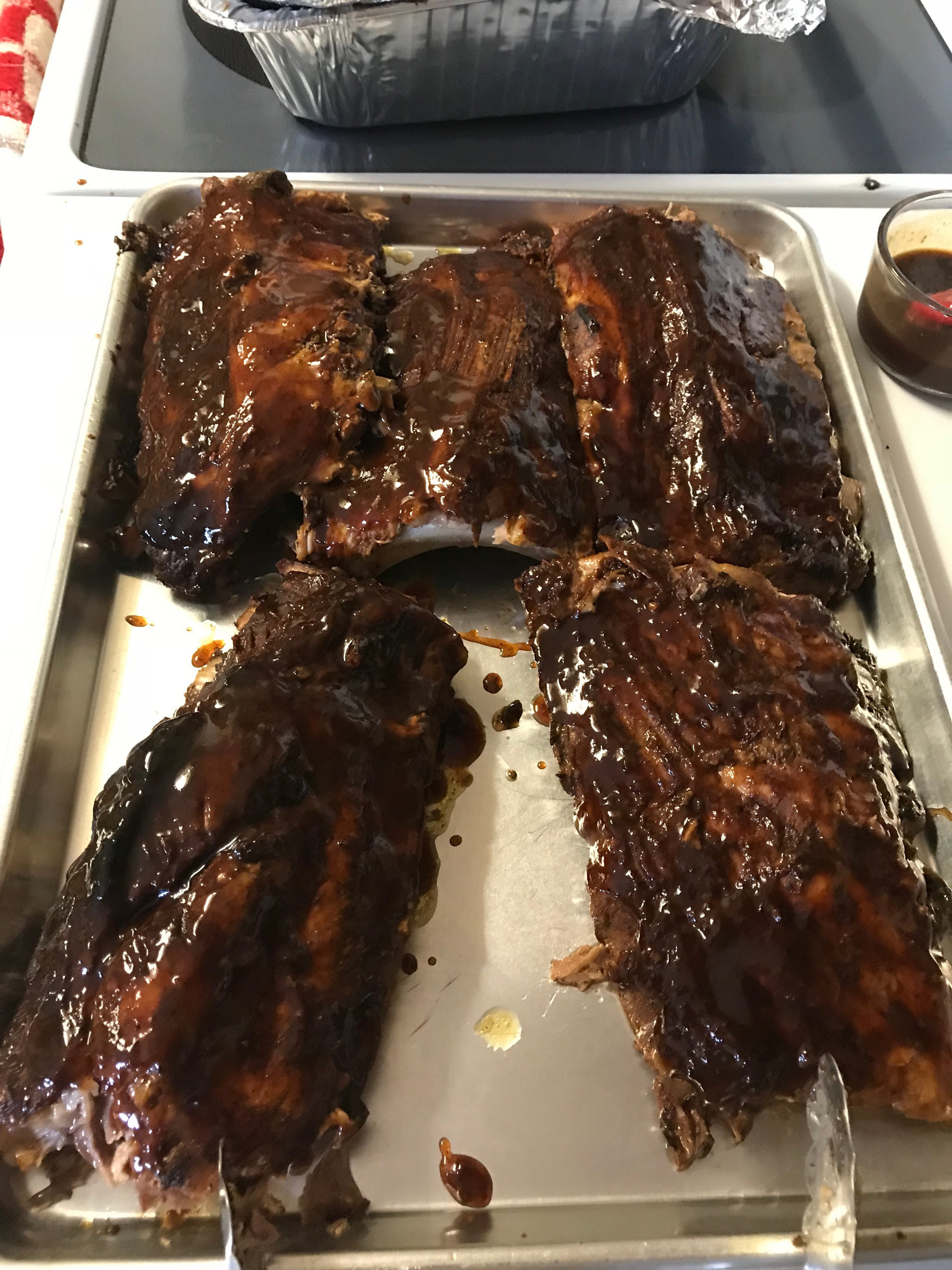 Then I started in an aluminum pan using a cup of water and half a bottle of The Shed Spicy Vinegar BBQ sauce and marmalade. Poured the sauce on the ribs and into the water. Into the oven at 300 for 3 hours. After that I added the rest of the sauce to the ribs and then put aluminum foil over the pan and back into the oven for 2 hours.