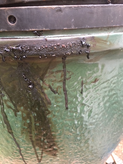 I have had my large BGE for many years and decided to clean it again.  I filled with fuel and ran the temp to 600 for several hours.  After about 30 minutes I noticed this black goo on the side... Then, I noticed that after I wiped it up it came right back.... leaking through the green on the outside of the egg.