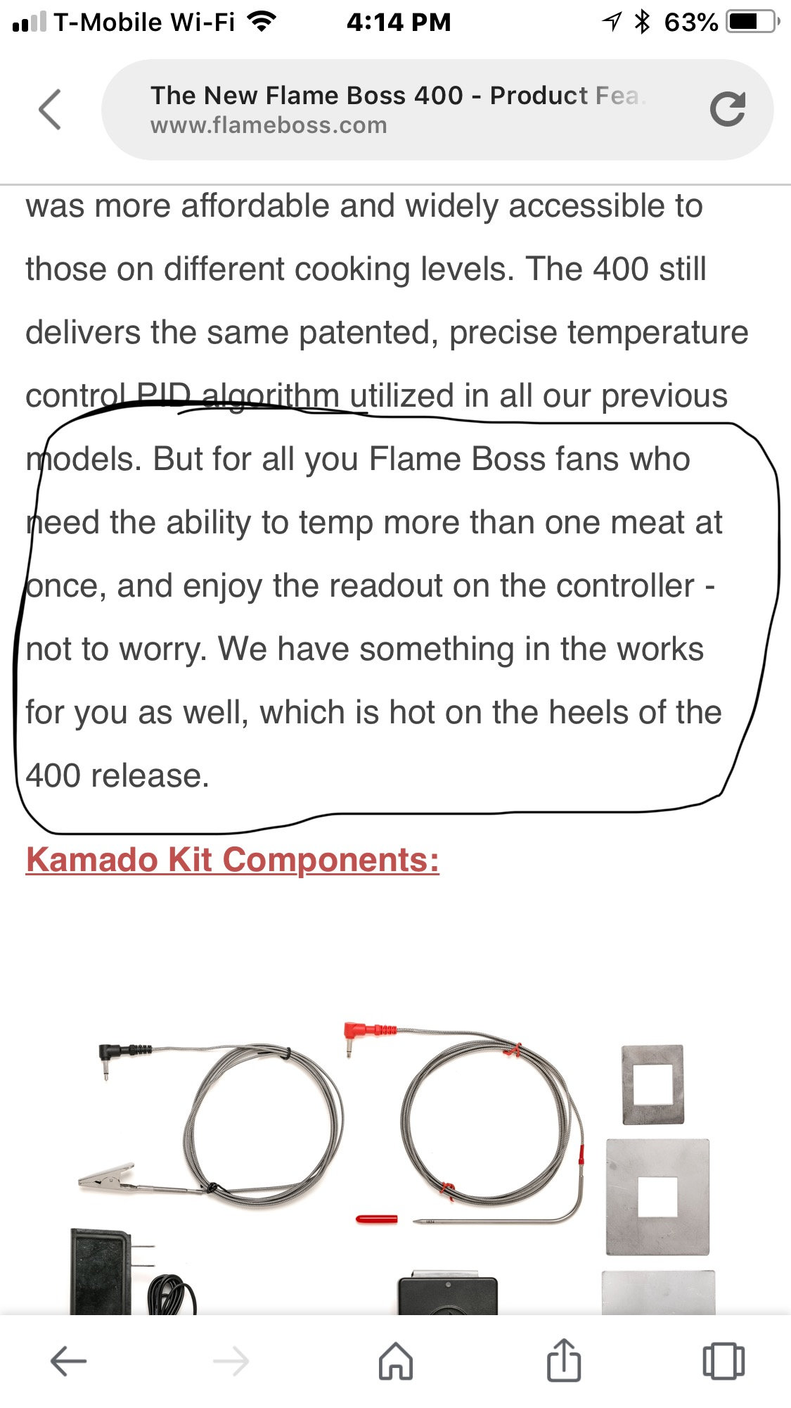 Exactly!  The 400 doesn't interest me at all.  The fan being part of the unit limits its use.  I was hoping someone here would have info that Flame Boss was coming out with a new model that had the 300 features and have the fan separate from the controller.  Some of us are forced to use BBQ Guru fans with our flame boss 200/300 to work with certain smokers.