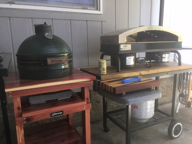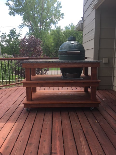on the deck, built the table myself. Getting ready to add a small egg to the collection so some modification is due.