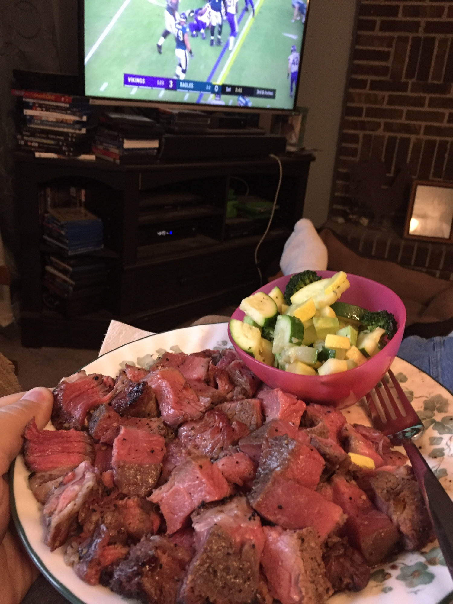 Rare steak & football!   Wilma’s was medium cuz that’s how she likes it.   Happy Sunday!