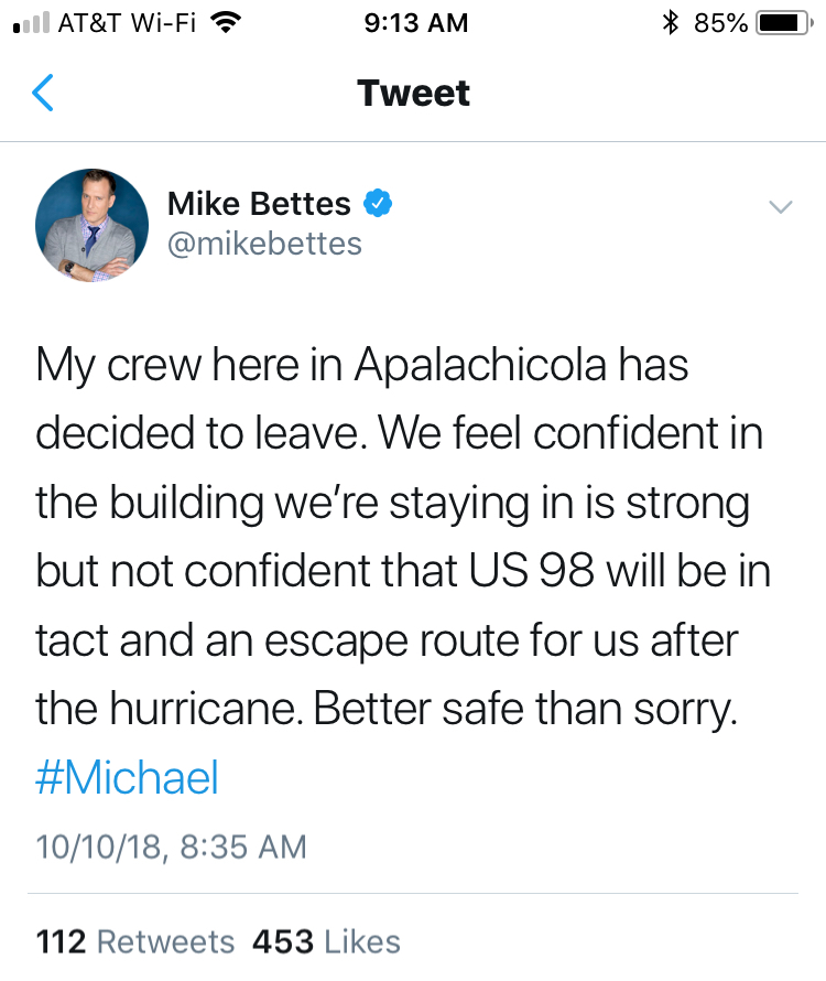 I wonder why the news crews don’t heed their own advice. Absolutely no reason for Jim Cantore to be broadcasting on site this morning. It’s a Cat 4 hurricane. We know there will be rain, wind, and subsequent damage.