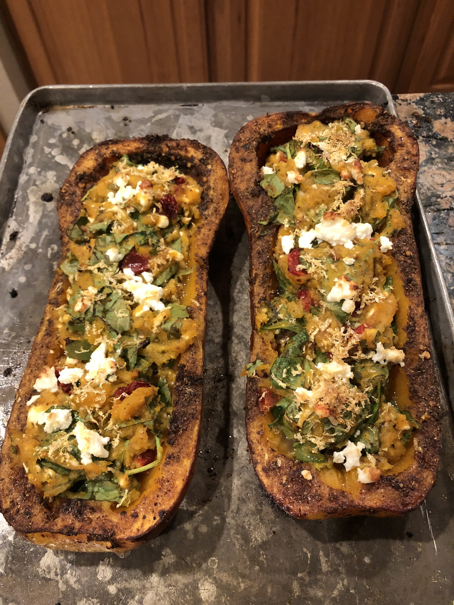 Great flavor.  Next time, I’ll cube the squash and roast it in a ci pan and skip the whole stuffed presentation.  It could easily take twice the spinach and garlic as well.  Great main, would be an excellent side as well.