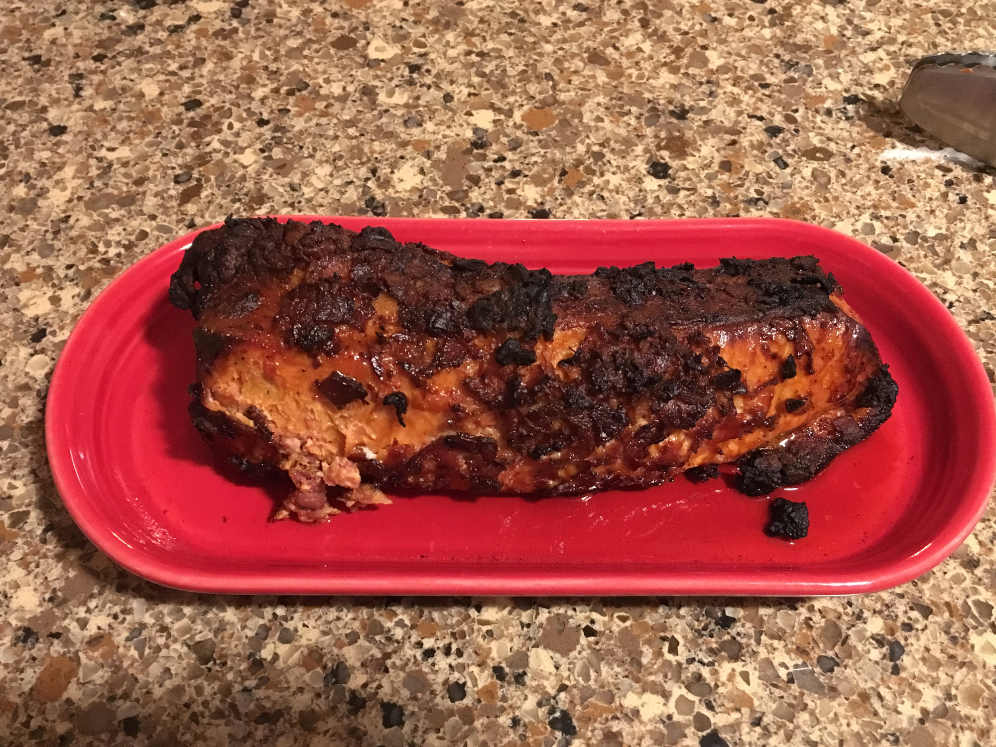 Pork came out KILLER! Went with 400° indirect, at the felt. Pulled at 155°(swmbo’s still not sold on pink pork). Still came out juicy as can be. Was covered in crumbles of bacon.