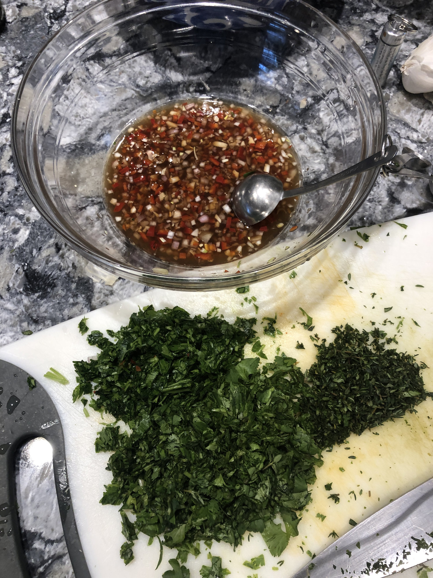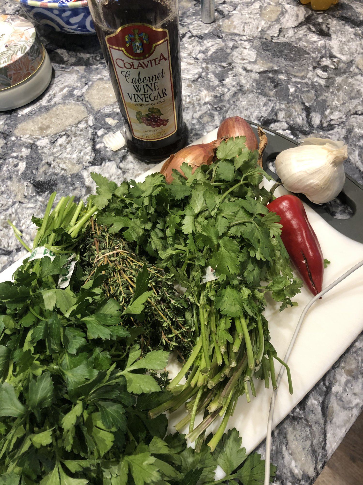 • I lived in Argentina on and off for a few years, and there are so many regional variations, but being the gringa I am (lol) you can literally make an amazing and simple chimmichurri with only 4 ingredients! I chop about a head of parsley in one of those mini electric food choppers (gringa!), 6 lg cloves of garlic through a garlic press (but feel free to add more if you like it extra garlicky!), teaspoon of salt, and then just fill the container you are using with vegetable oil (or whichever oil you prefer) to cover parsley well...stir and voila! It will keep in frige forever and is awesome to put in your mashed potatoes too :)))
