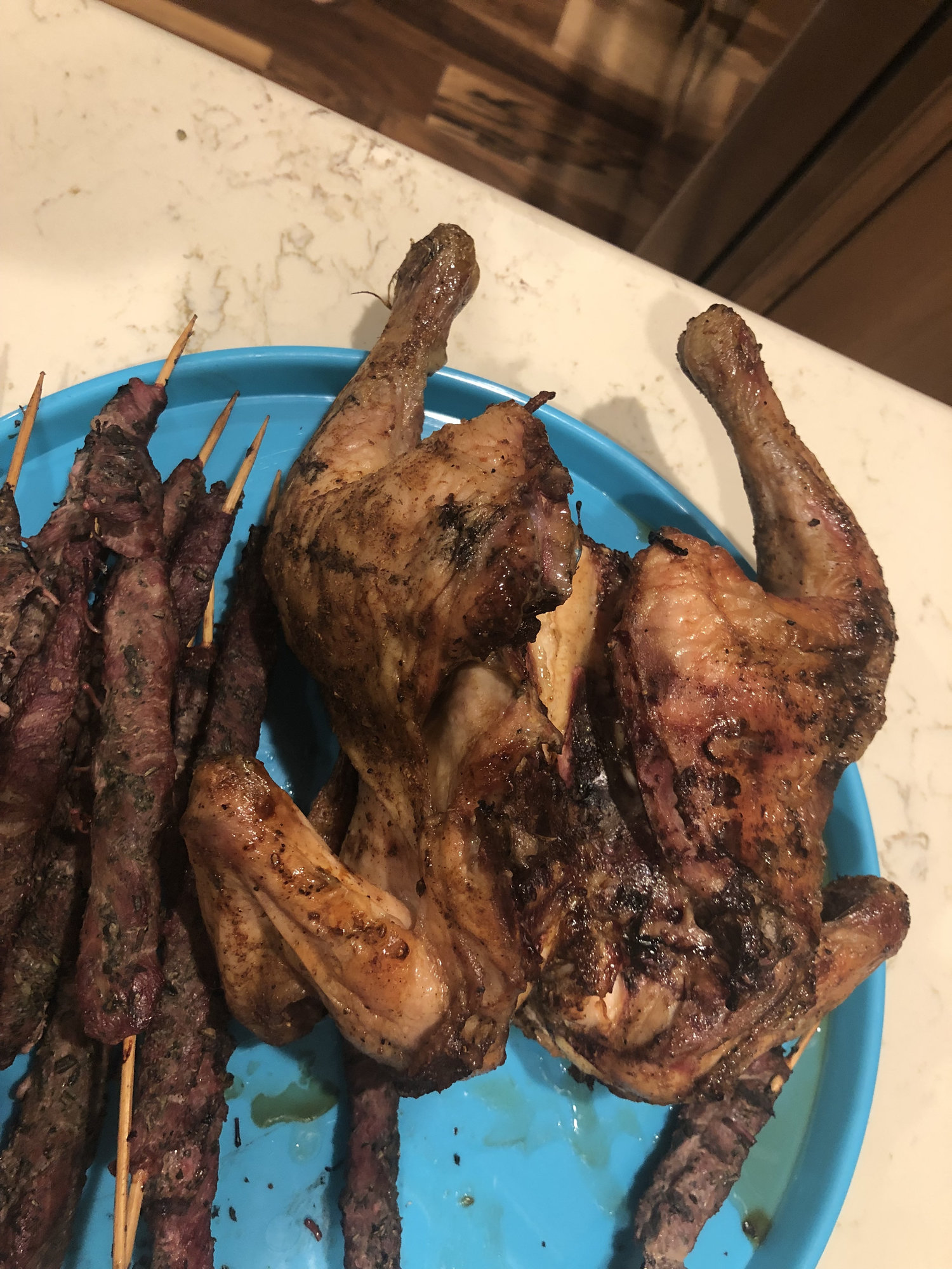 Came home for lunch wound up reading a super long thread on here so I decided to cook a little bird with dizzy pig fajita seasoning (well I think thats what it was) and had a few arrosticini I didnt cook from last night so they went on as well.