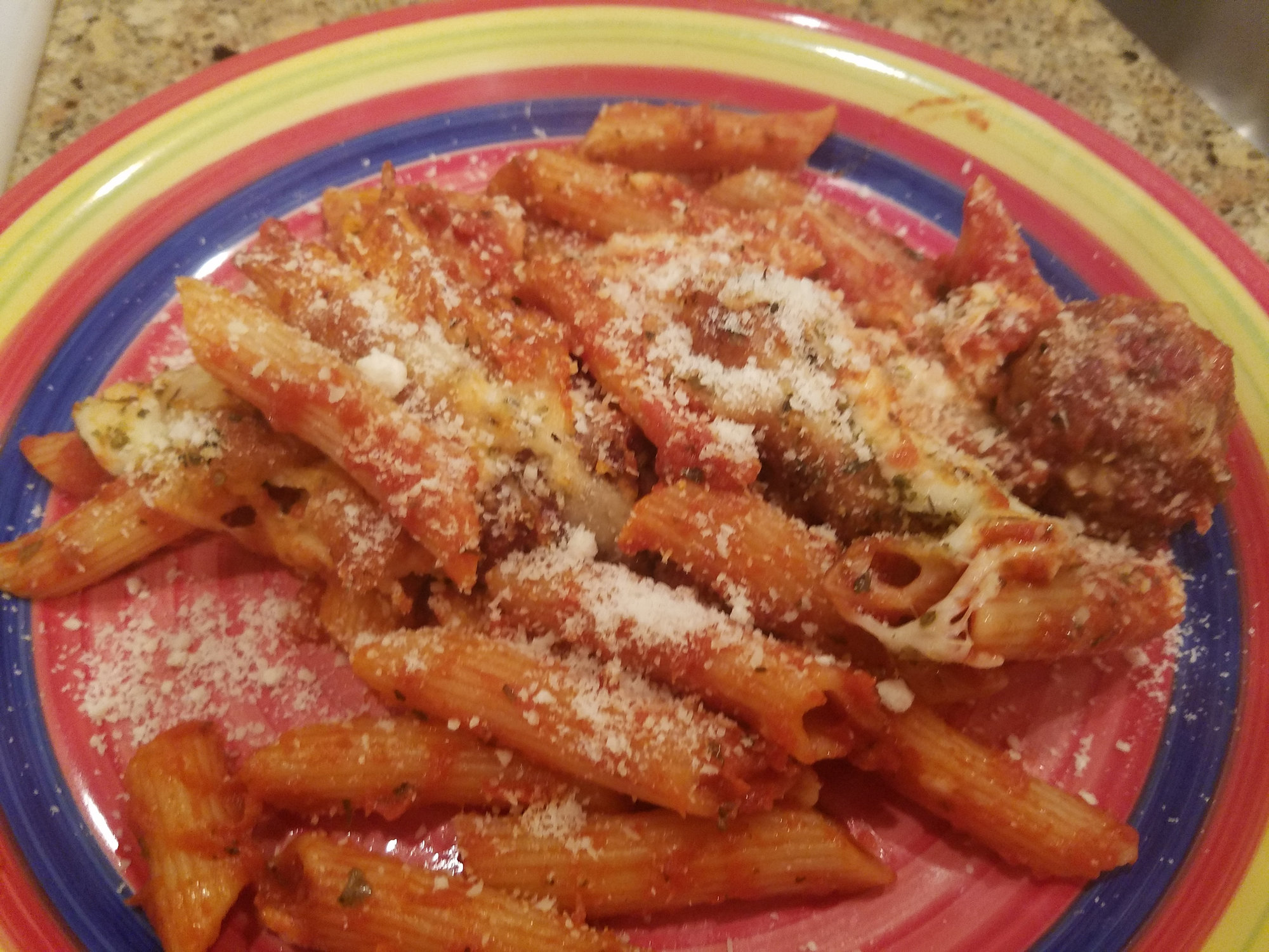 I was craving meatballs but the wife vetoed subs, so spaghetti and meatballs was the compromise.  I smoked the meatballs at 350 with cherry because I was out of oak and it gave them a nice red brown color.  I pulled them at about 140 and and tossed them in with penne and sauce and topped with mozarella and parmesan and put back on the egg at about 425 for about 30 minutes.  Pretty simple and pretty good.  The family liked the smoke on the meatballs more than the usual.  And I held some meatballs back for a sub for me for lunch tomorrow.