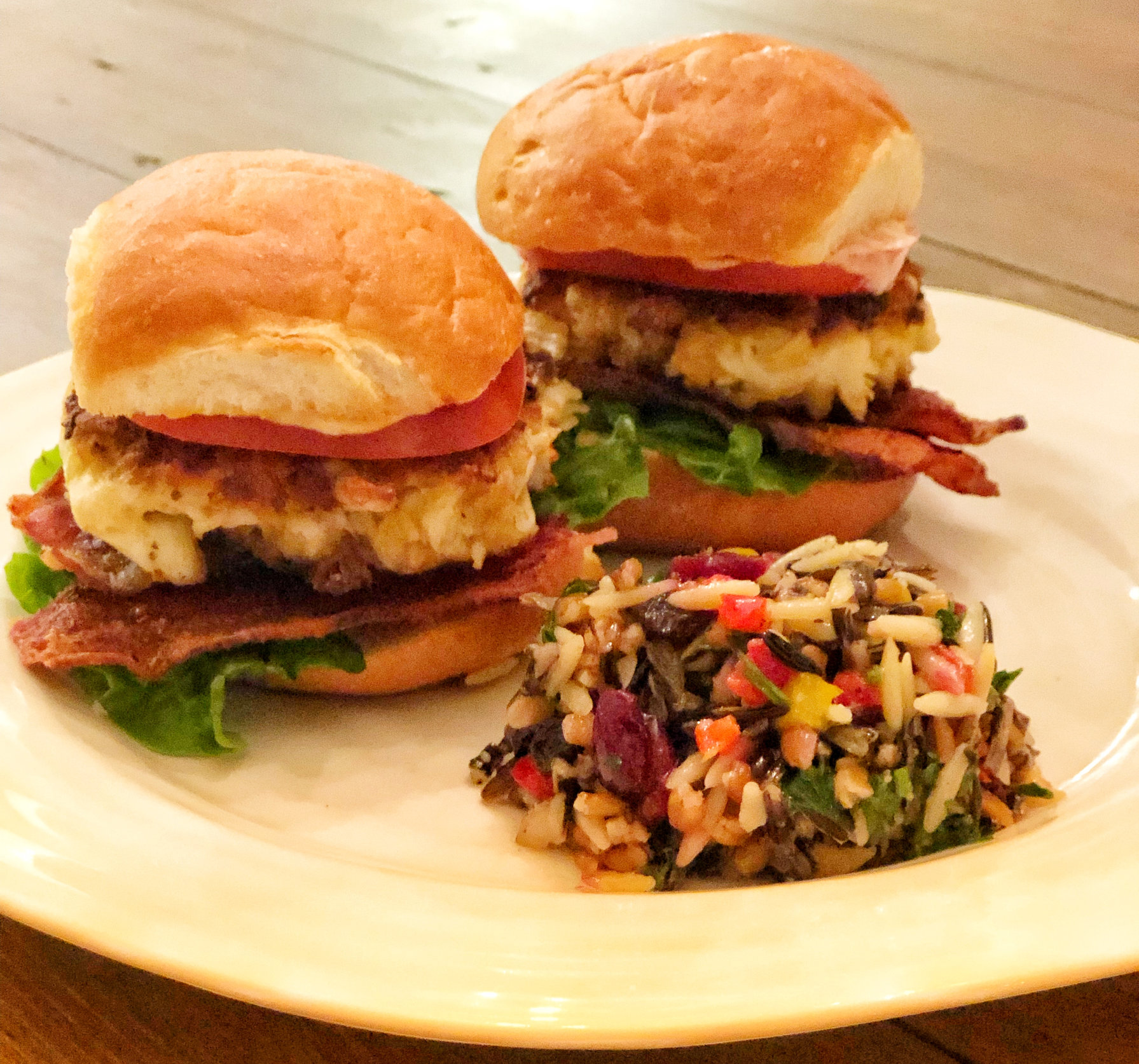 Crab cake BLT and sriracha aioli. Served with a side of red currant, bell pepper, and corn orzo (a little rip off of J Alexander’s orzo pasta)